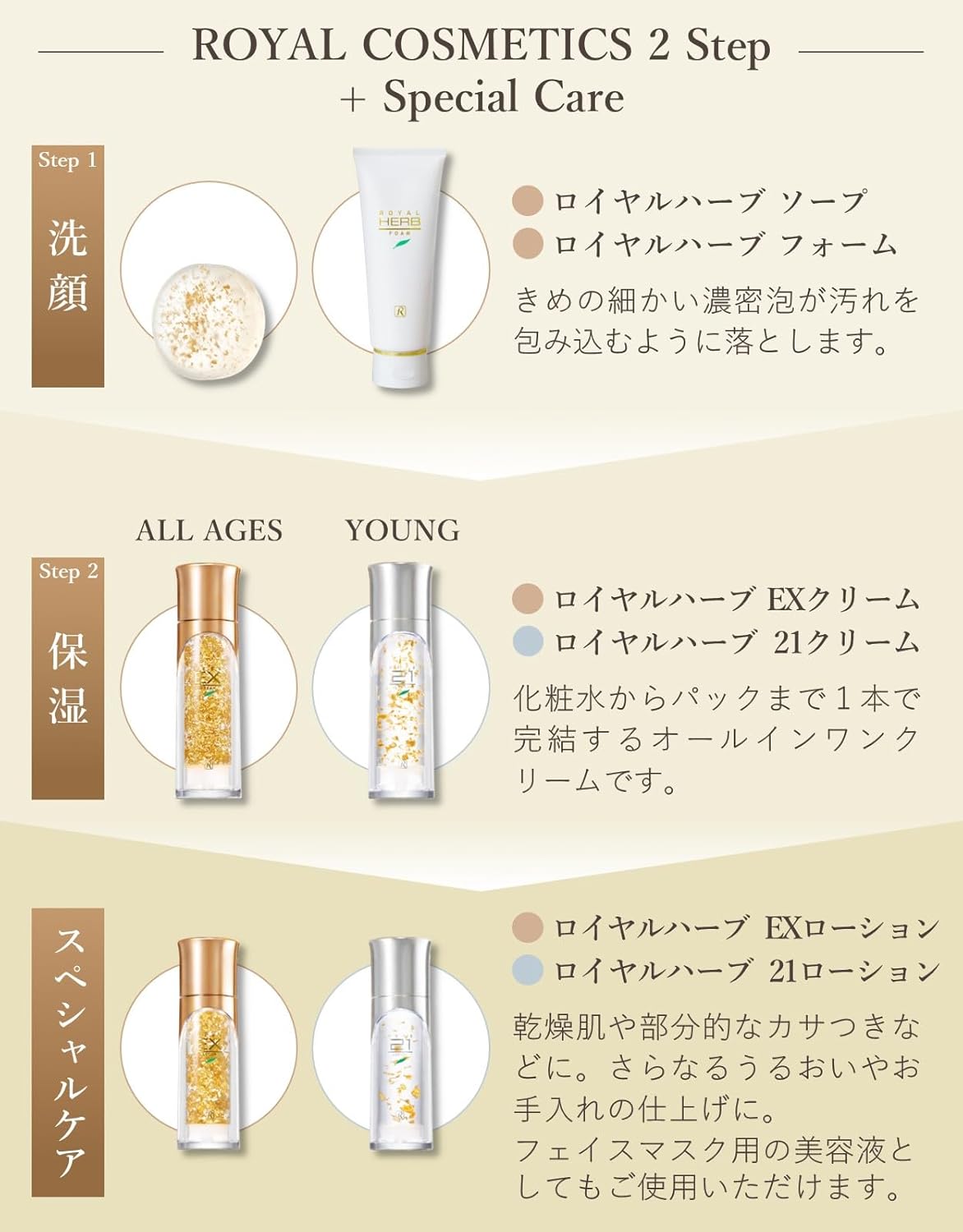 純金箔入、ノンオイル、ノンアニマル(ハラール認証済)、無香料で洗顔後に塗るだけ簡単お手入れです。