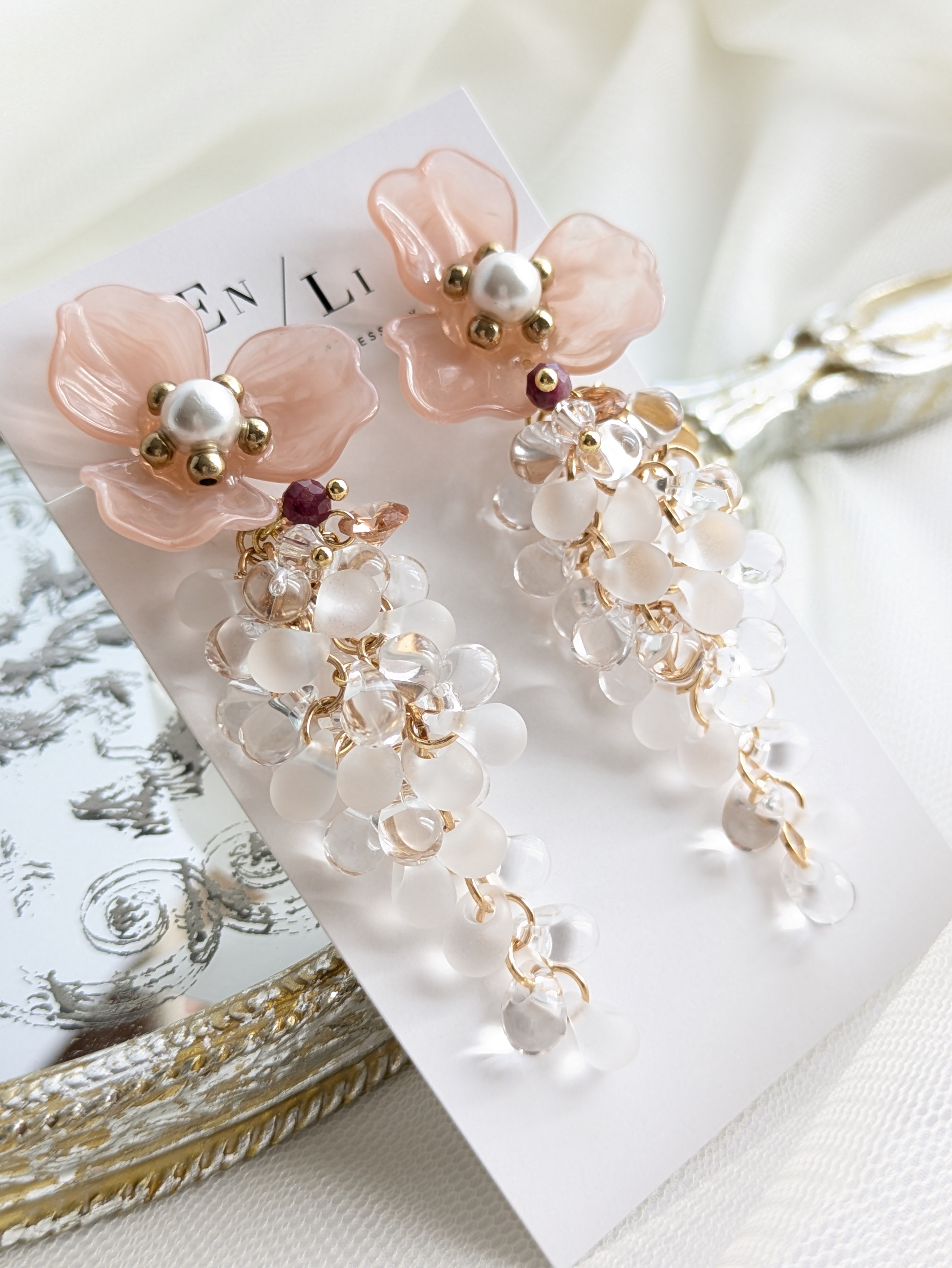 クリアビーズが光の角度によって美しい輝きを見せ、