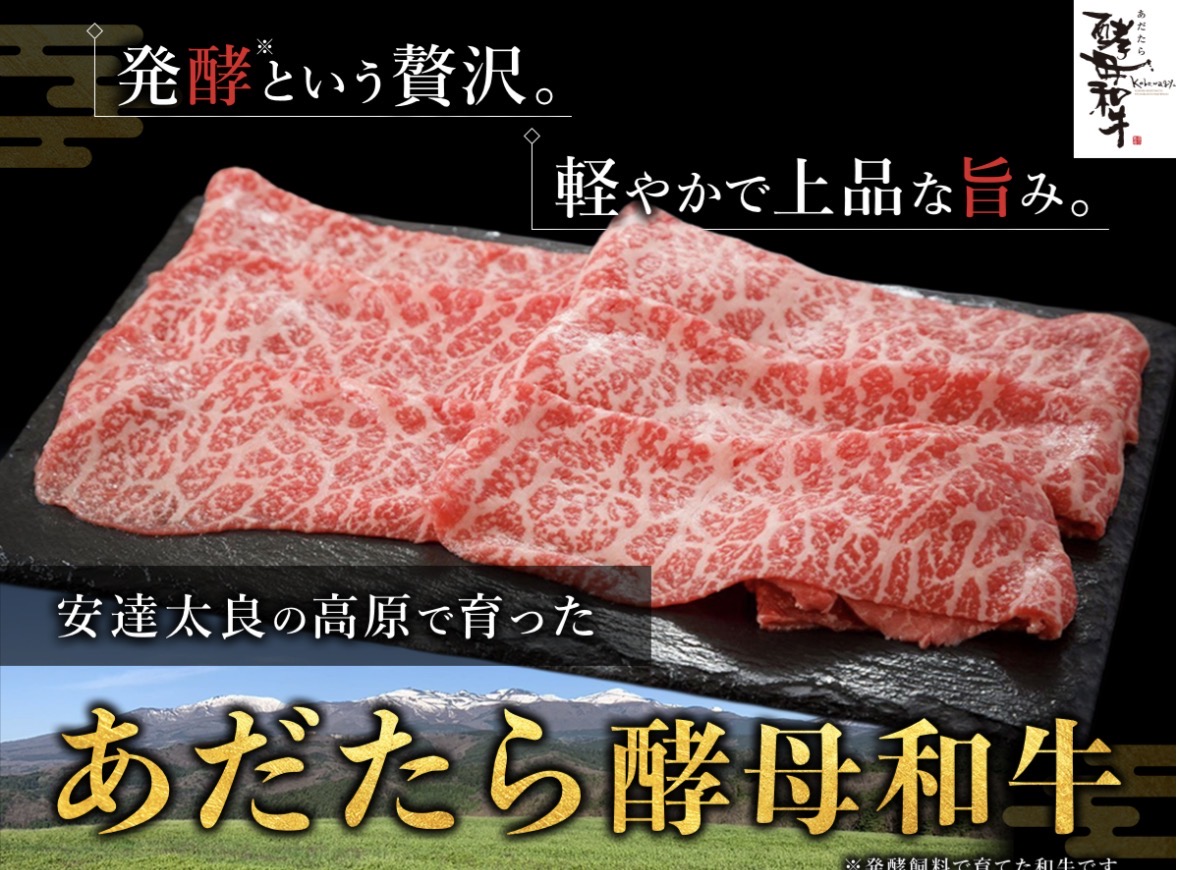 A. 安達太良山の麓で、食品循環資源(米ぬか、おからなど)を、「酵母発酵」した飼料を食べており、黒毛和牛なので、この名前になりました。