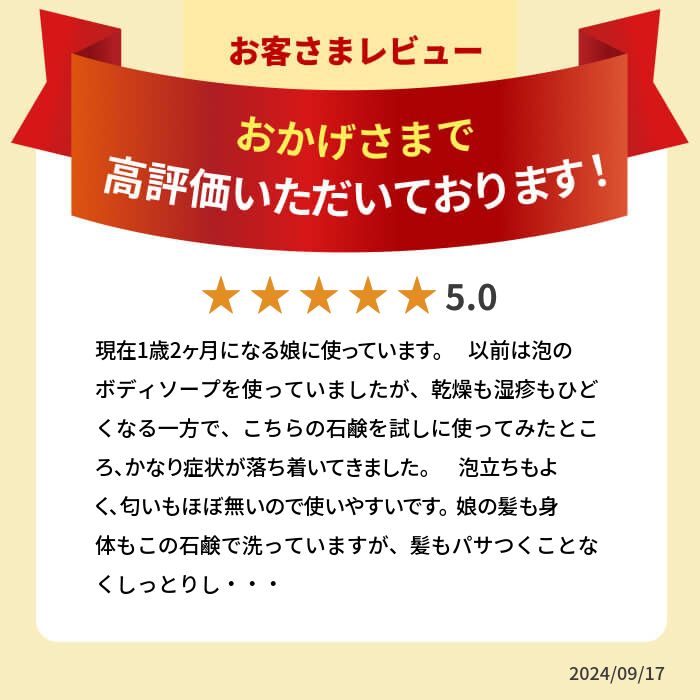 着色料・香料は配合されていないので、乳幼児から乾燥肌・敏感肌などの大人まで、洗顔だけではなく全身(髪)にも使えます。