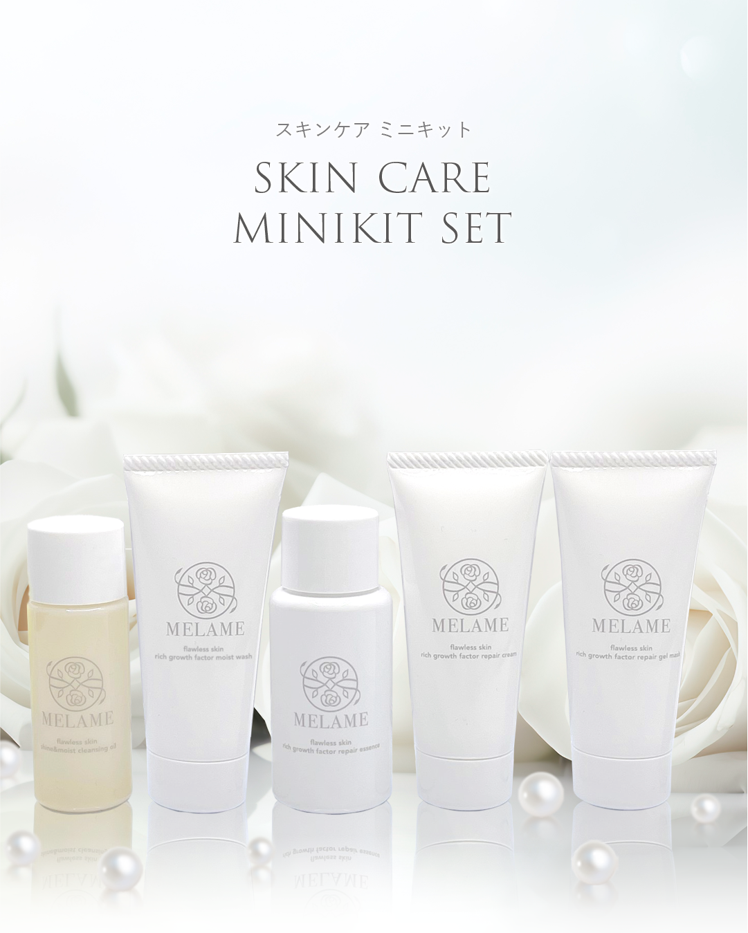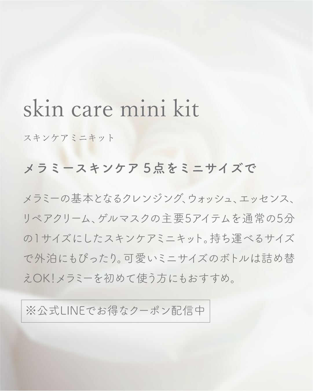 メラミーの基本となる主要5アイテムを通常の5分の1サイズにしたスキンケアミニキット。