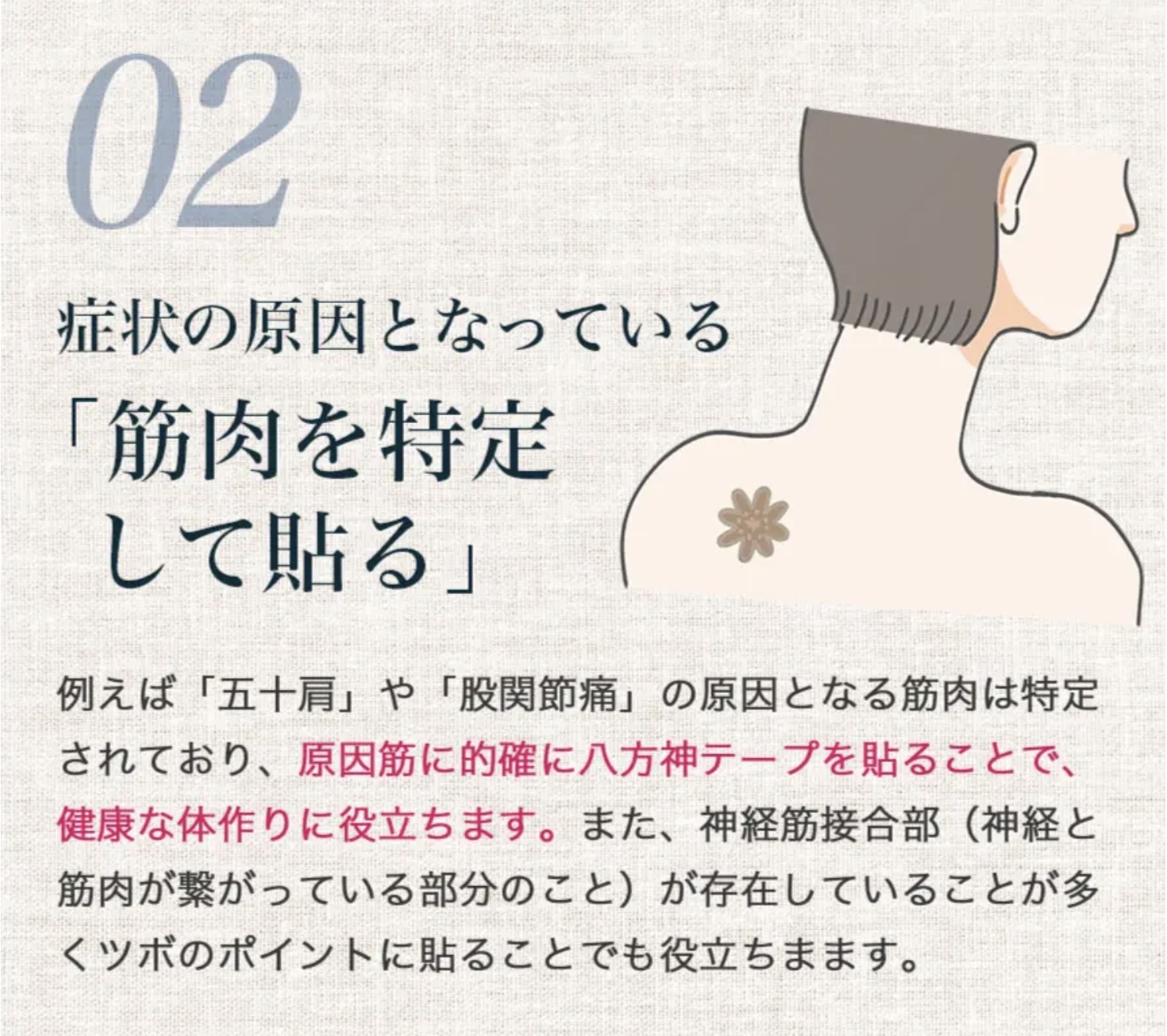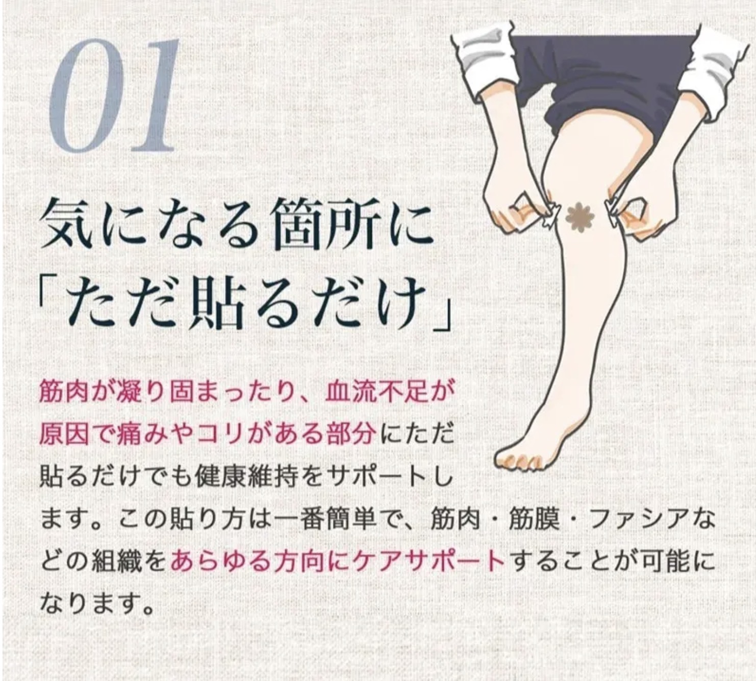 気になる場所に寄り添う絆創膏。 独自の八角形構造が身体のめぐりをサポート。 気になる箇所に貼るだけで、貼った部分がじんわりと温かく感じます。 全身にお使いいただけて、手足に貼ると伸びやかな感覚に。 鎖骨周りに貼ると自然と呼吸に意識が向きます。 肩や首回りをすっきりさせたい方におすすめ。 敏感肌の方にもご使用いただけるように、肌に優しい素材を厳選しています。 日常生活やスポーツ時のケアなど、毎日の習慣に。