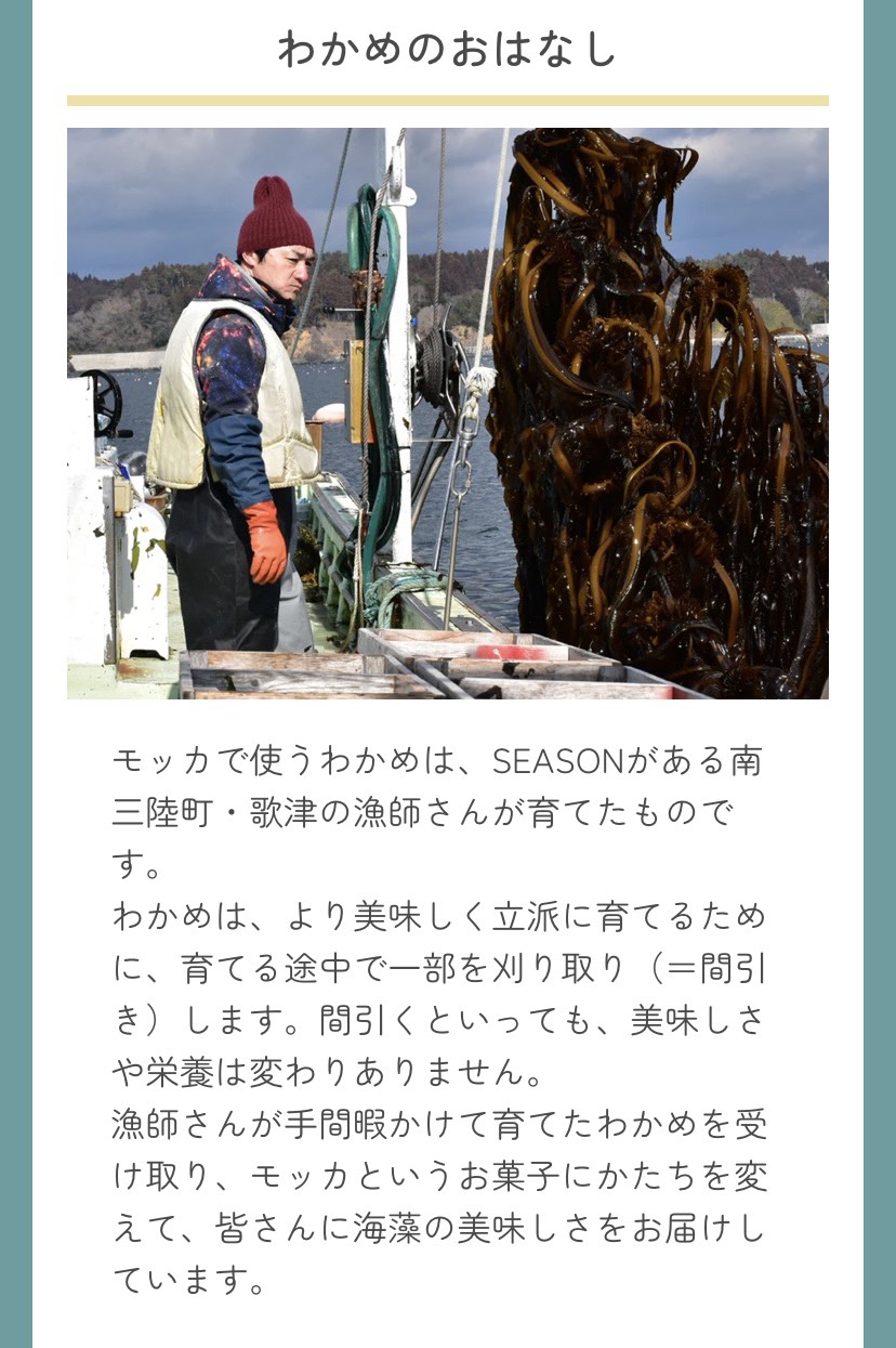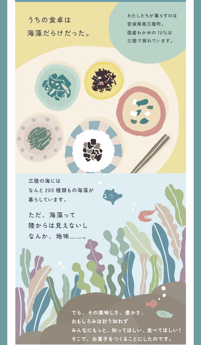 | 原材料名 | わかめ(宮城県)、米粉[米(宮城県)]、米油、藻塩(海水・海藻)、すじあおのり(岩手県)、わかめパウダー[わかめ(国産)]、昆布粉[昆布(国産)] |