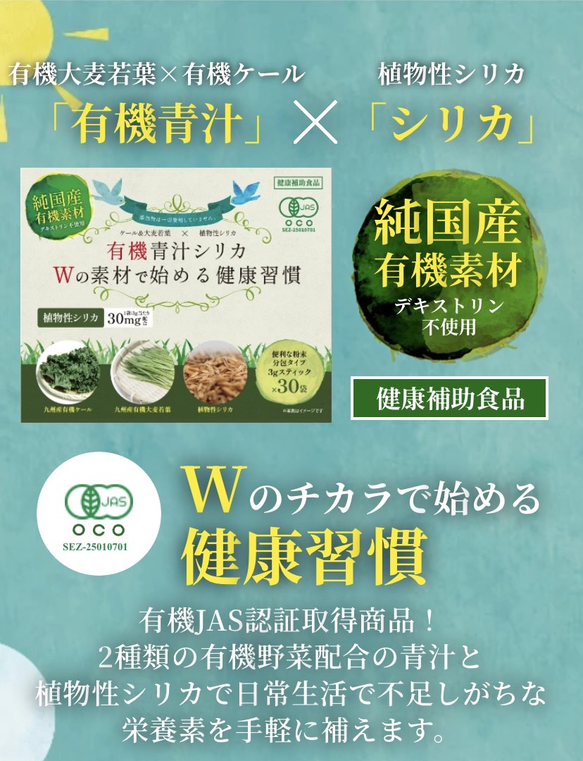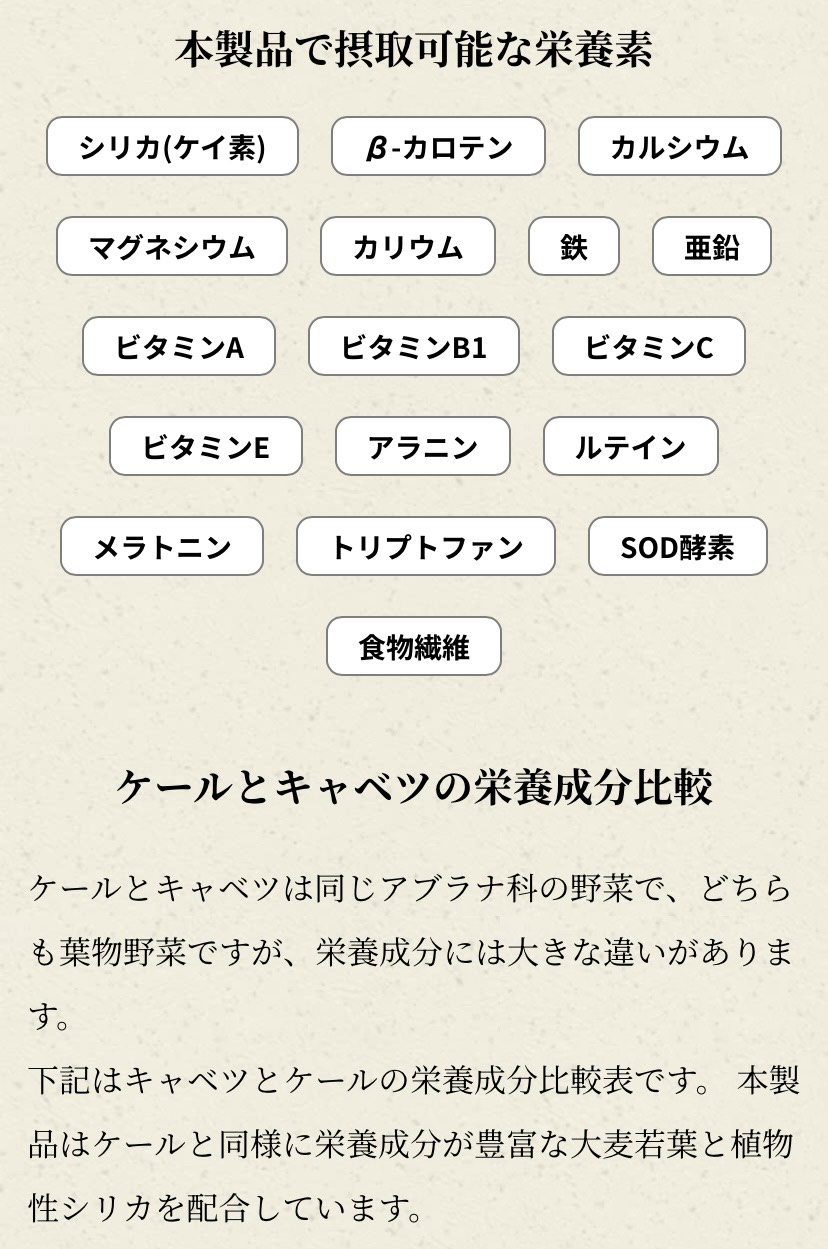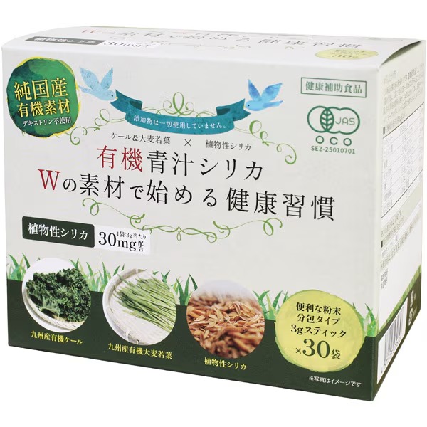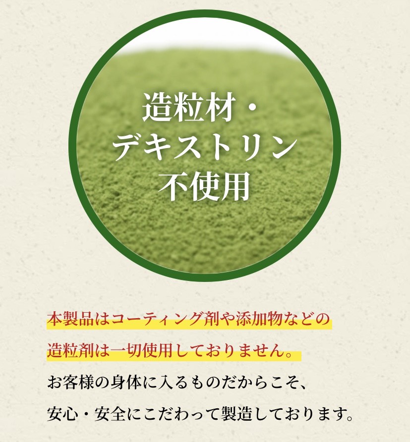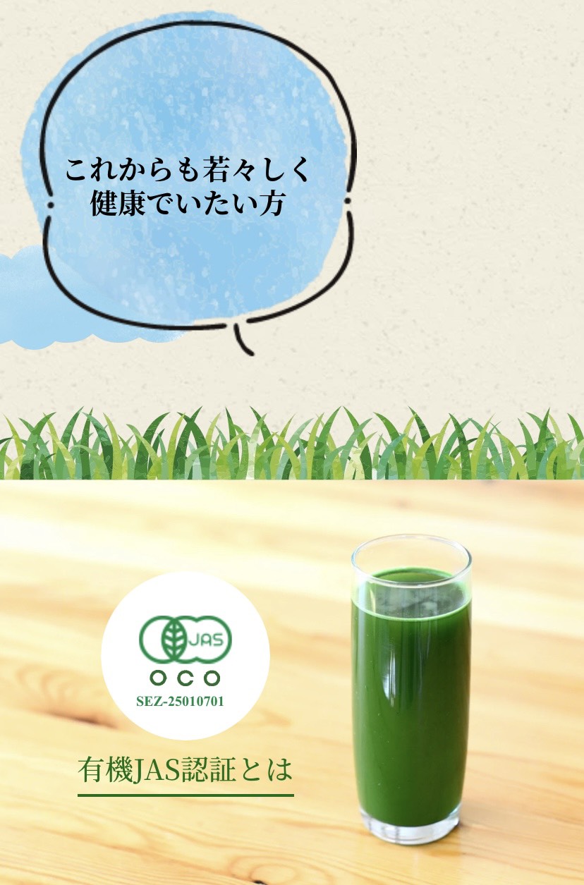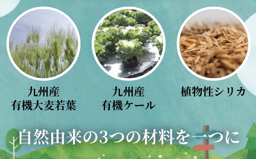 | 原材料名 | 有機大麦若葉末[有機大麦若葉(九州)]、有機ケール末[有機ケール(九州)]、植物性シリカ末[籾殻(国産)] |