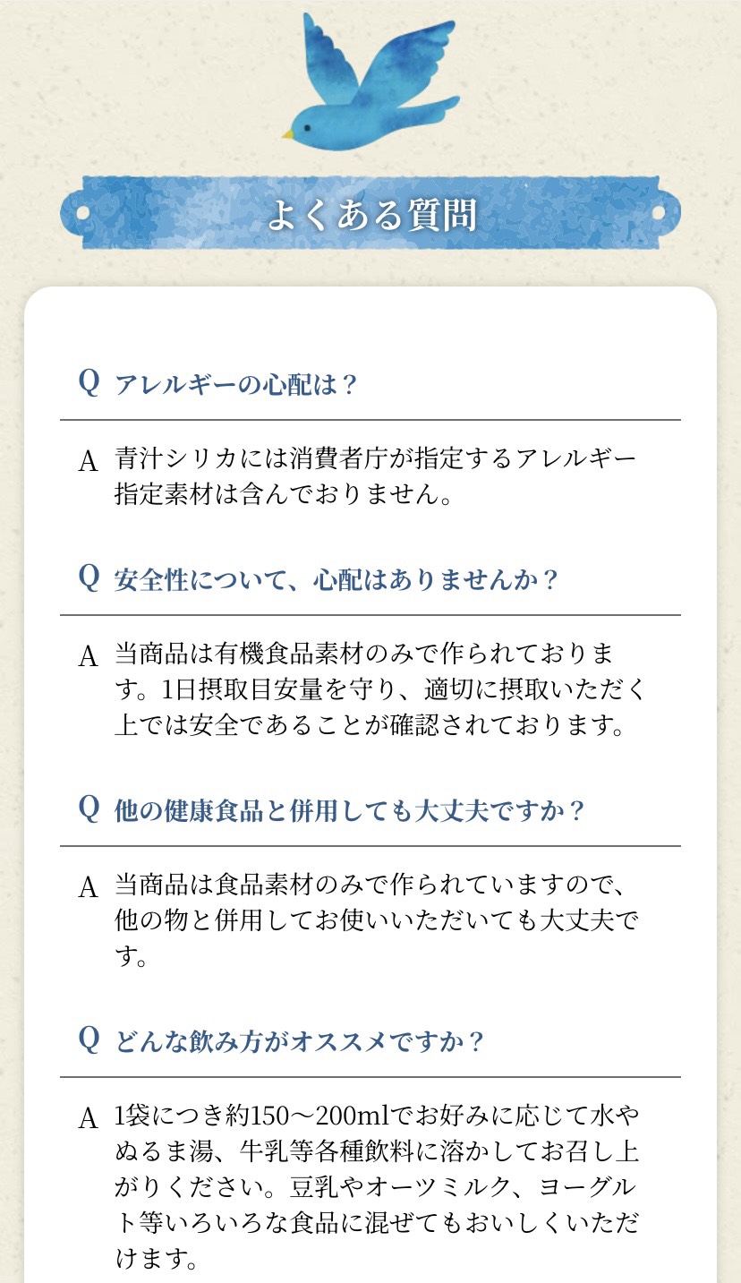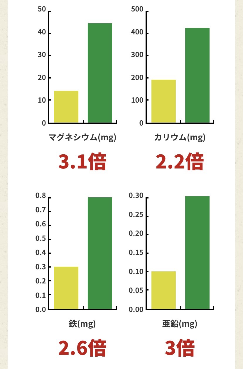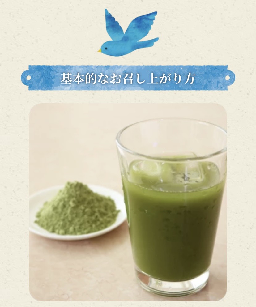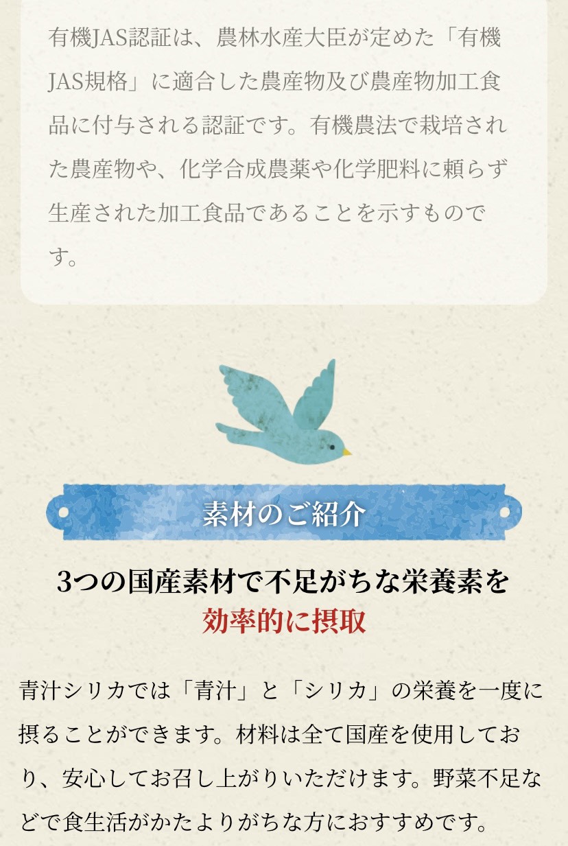 | 原材料名 | 有機大麦若葉末[有機大麦若葉(九州)]、有機ケール末[有機ケール(九州)]、植物性シリカ末[籾殻(国産)] |