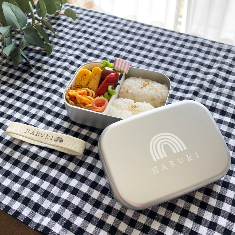 シンプルなアルミ製のお弁当箱、名入れしたランチベルト付きもあり♪