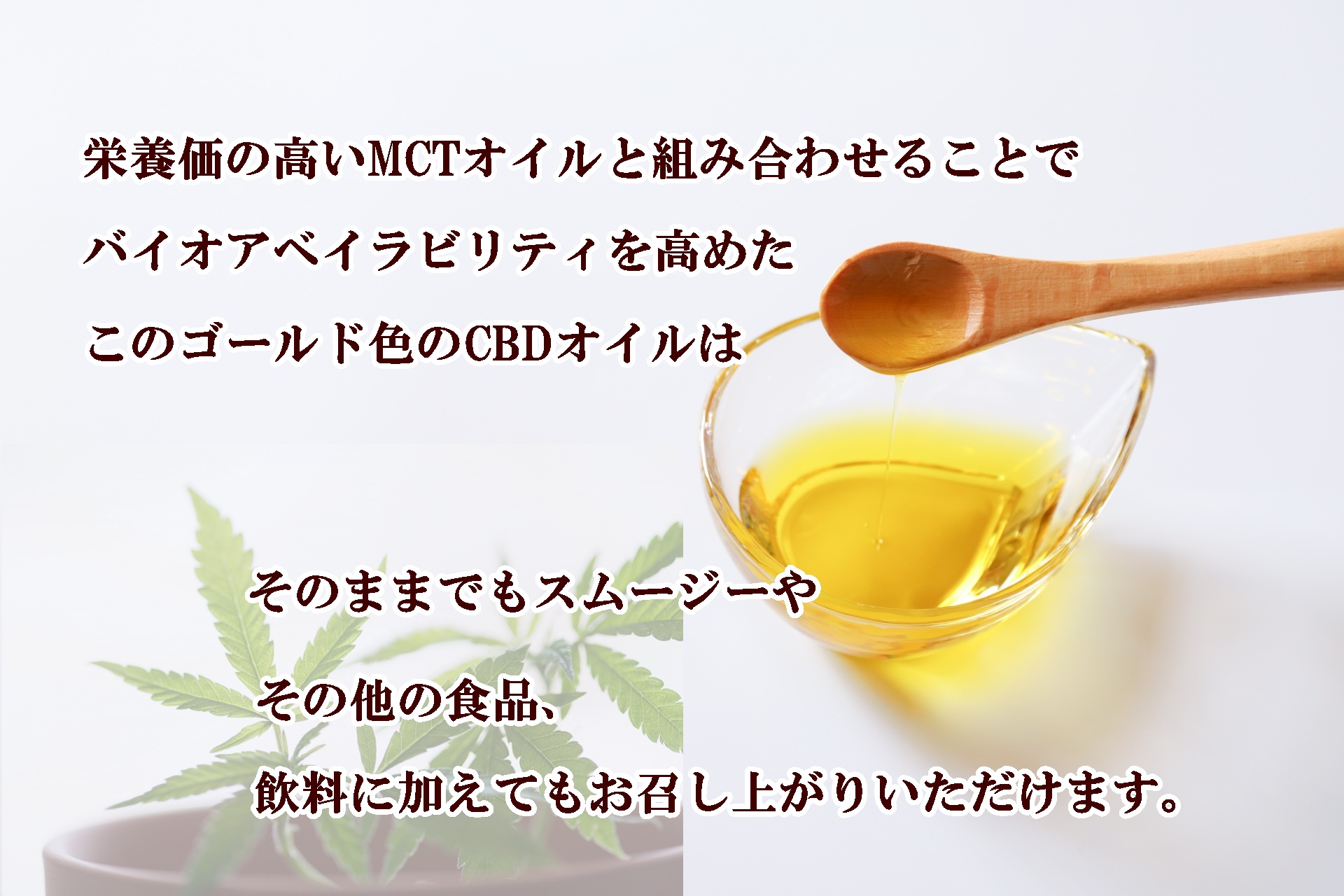 栄養価の高いMCTオイルと組み合わせることでバイオアベイラビリティを高めたこのゴールド色のCBDオイルは、そのままでも、スムージーやその他の食品、飲料に加えてもお召し上がりいただけます。