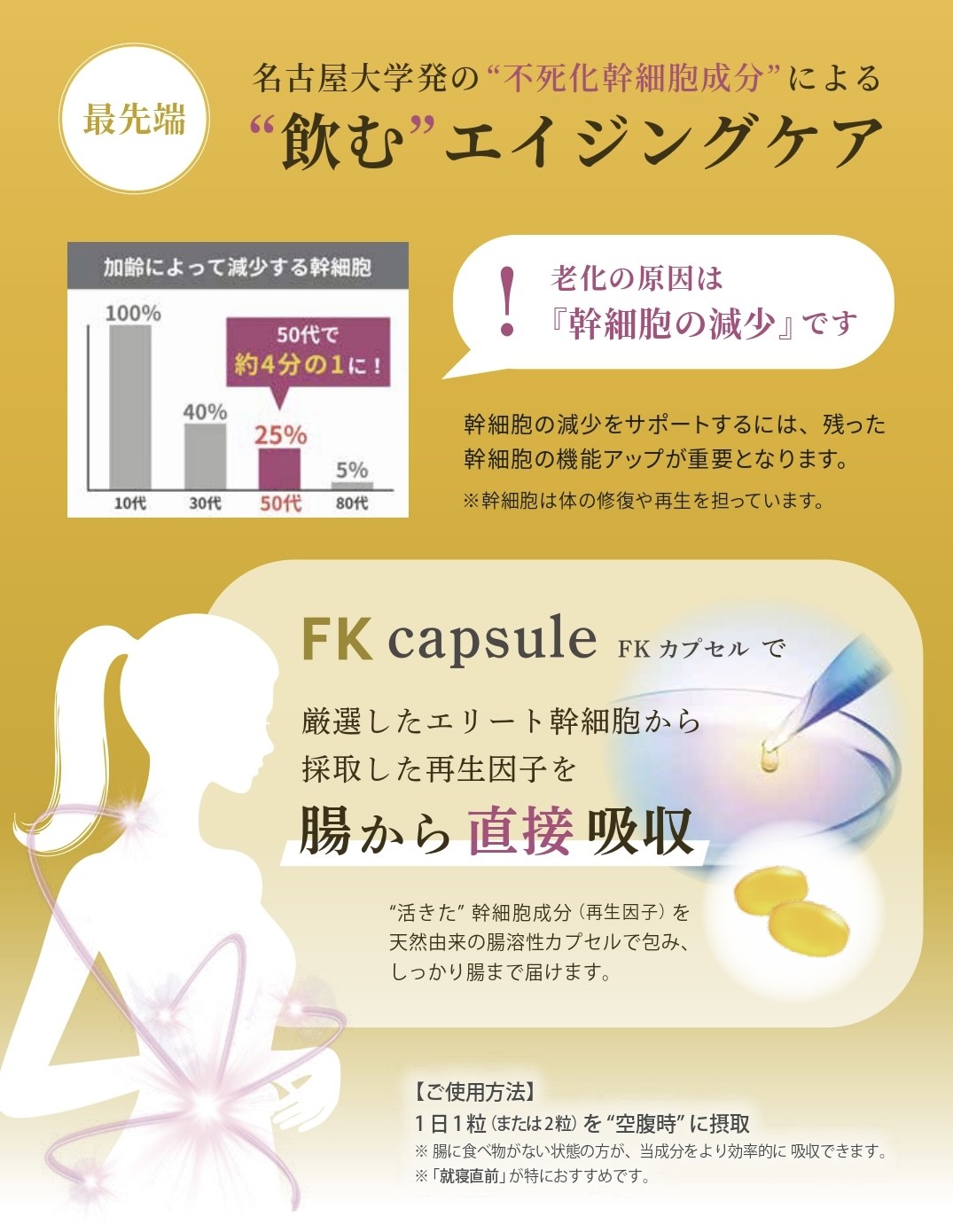 厳選したエリート幹細胞から採取した再生因子を腸から直接吸収。”活きた”幹細胞成分(再生因子)を天然由来の腸溶性カプセルで包み、しっかり腸まで届けます。