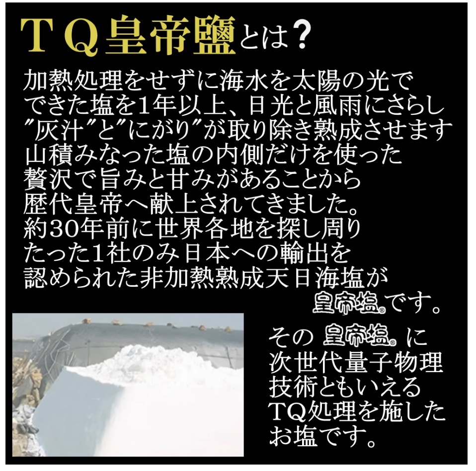 いっさいの加熱処理を行わず、海水を太陽の光と熱でできた塩を1年以上太陽光と風雨にさらし熟成させた、旨みと甘みの凝縮されたお塩です。