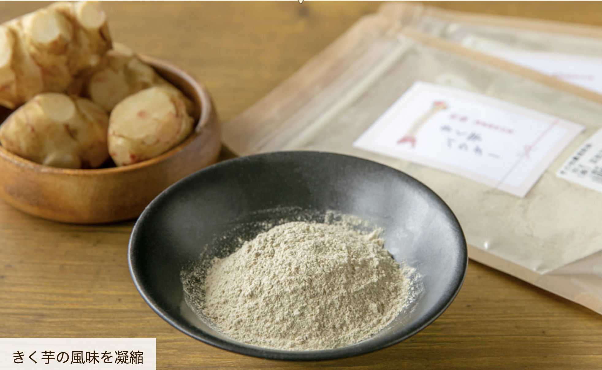 上越市頚城区にある「百姓や本舗」は、きく芋の生産から加工までを一貫して自社で行っています。今回は、「きく芋パウダー」をご紹介。農薬や化学肥料を使わずに育てた「きく芋」を、まるごと使用しています。きく芋をスライスしてから低温乾燥。その後、パウダー状にすることで、きく芋の優しい甘さと香りをぎゅっと凝縮しています。味噌汁やスープ、牛乳などに溶かしたり、シフォンケーキやマフィンの生地に混ぜたり、さまざまなアレンジができますよ。
