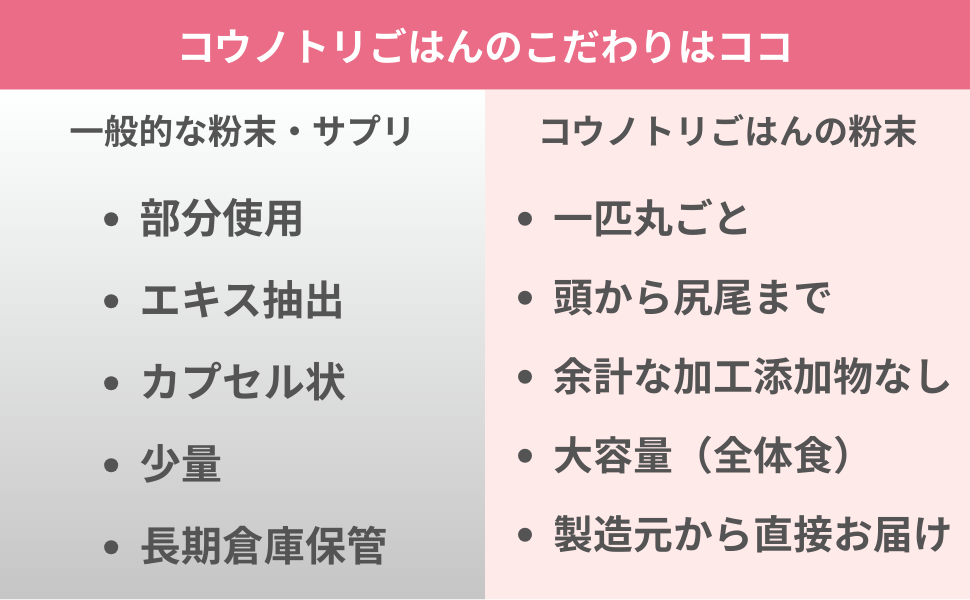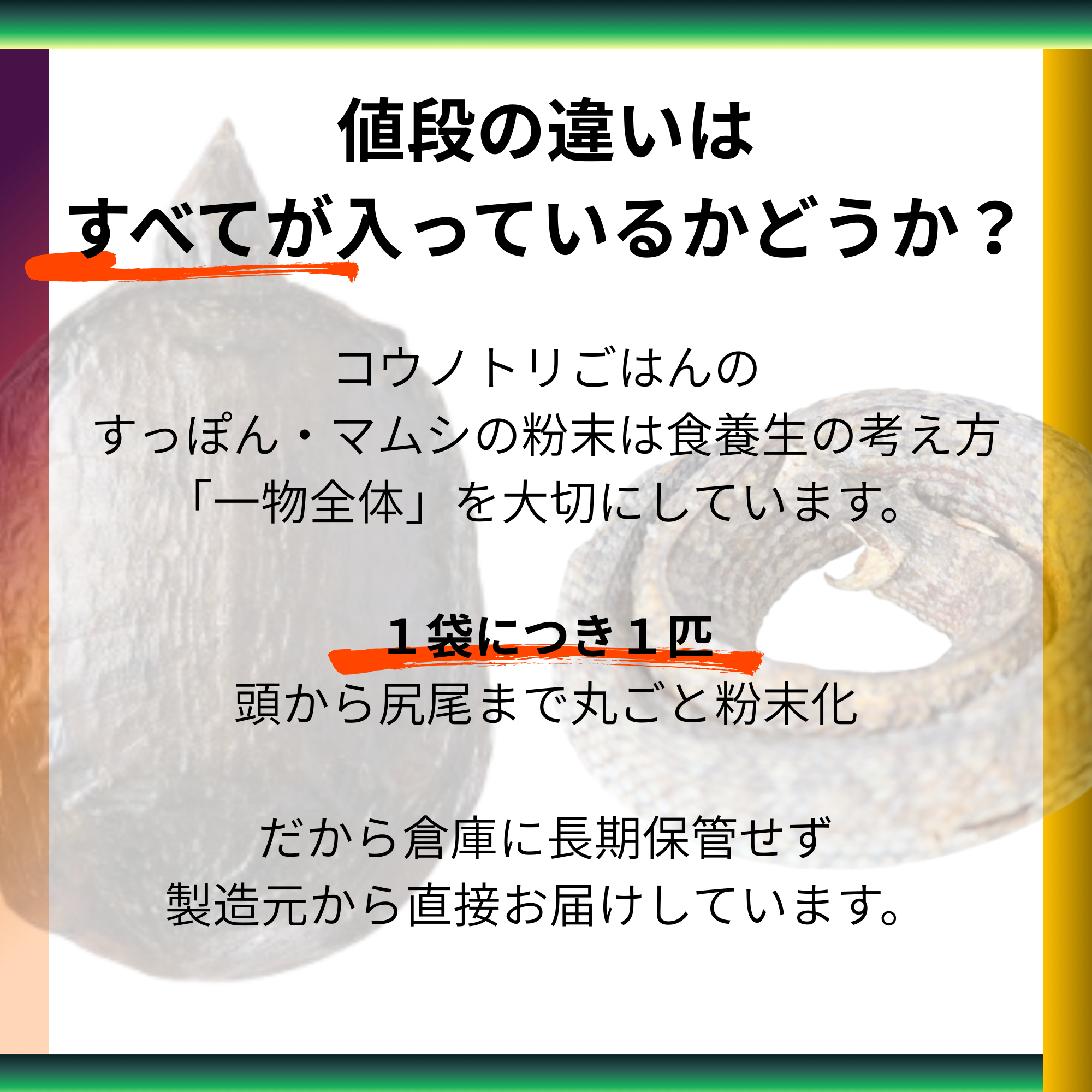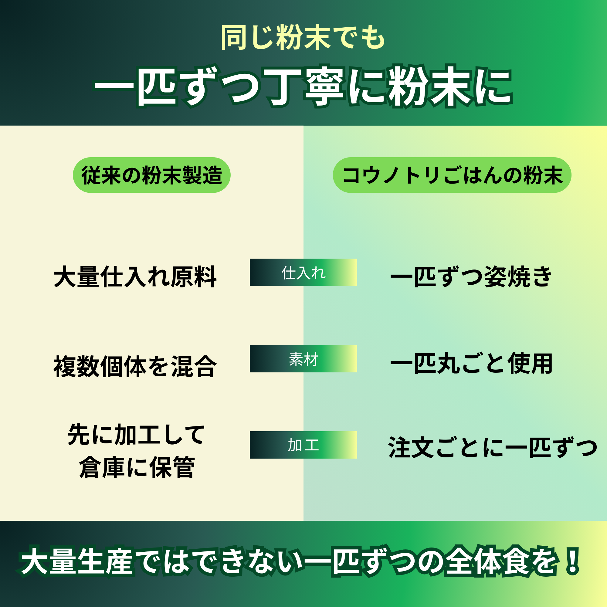 コウノトリごはんの粉末は、一匹を頭から尻尾まですべて粉末にした「食材」です。