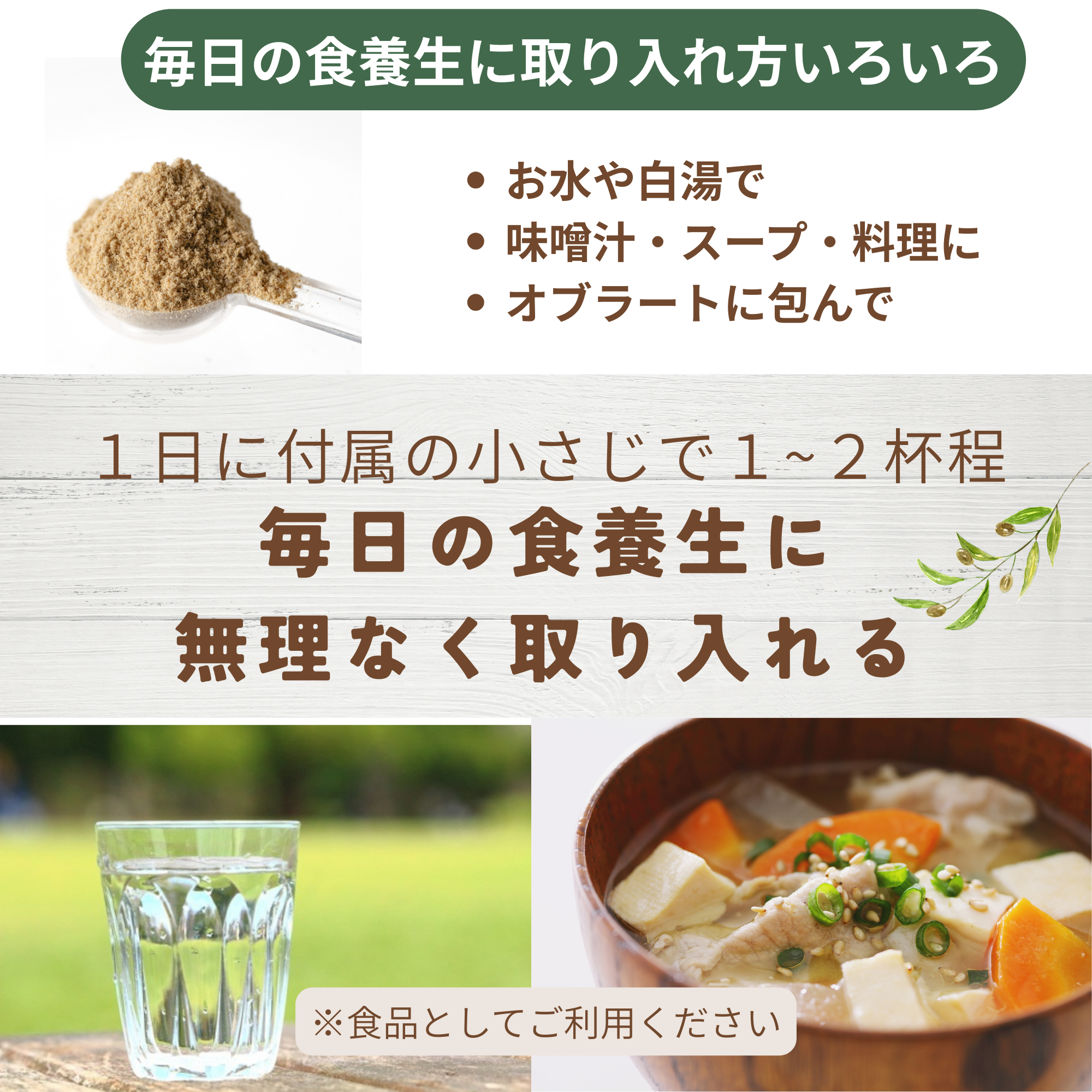 独特の香ばしさと深いコクは、素材そのものの力。 お湯に溶かして飲むだけでなく、お料理に加えることで、家族みんなで「一物全体」の恵みを分かち合えます。