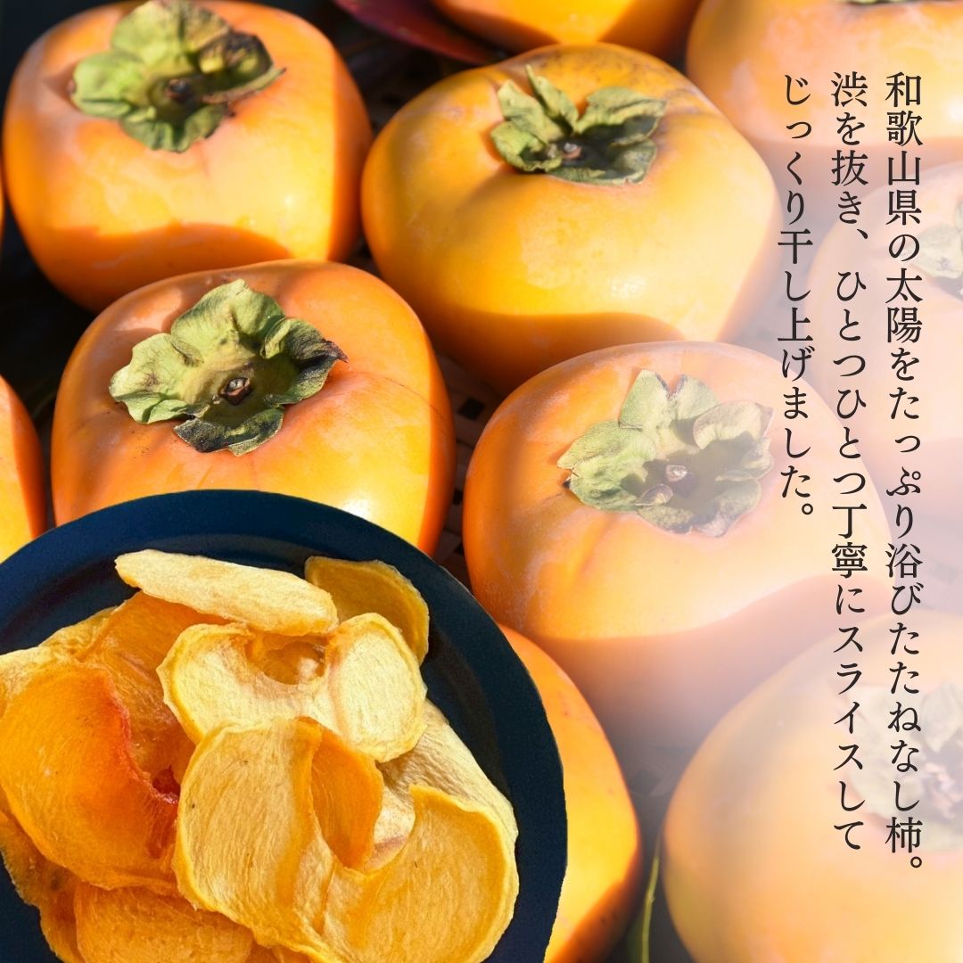 和歌山県かつらぎ町の太陽をたっぷり浴びて育った柿を、ひとつひとつ丁寧に皮をむき、渋を抜いてスライスして干し上げました。