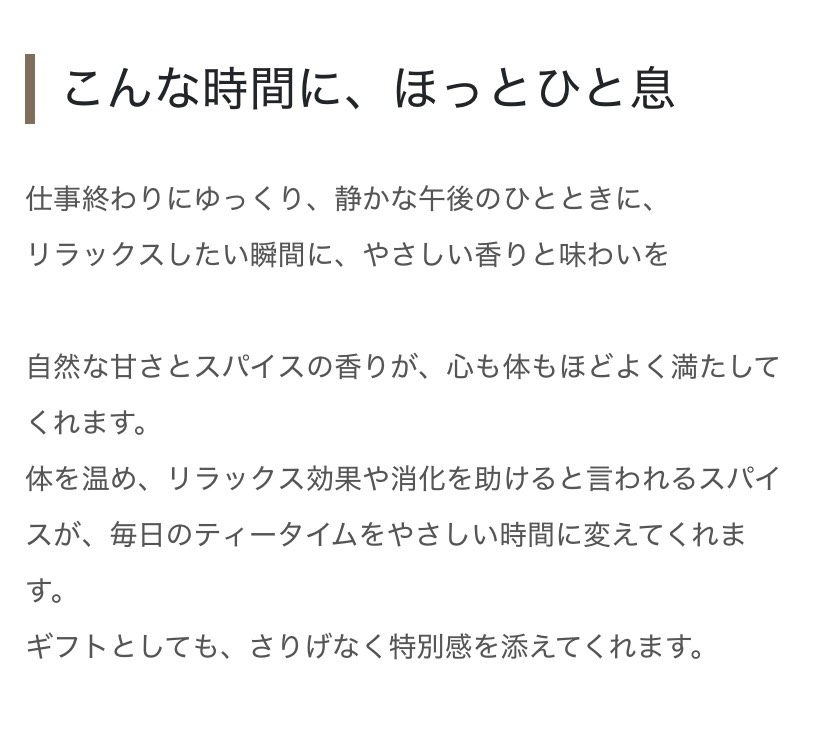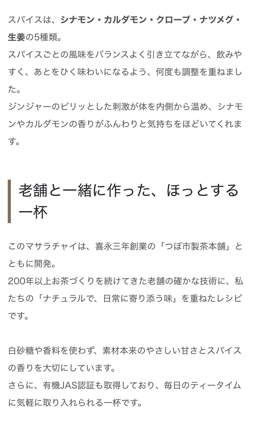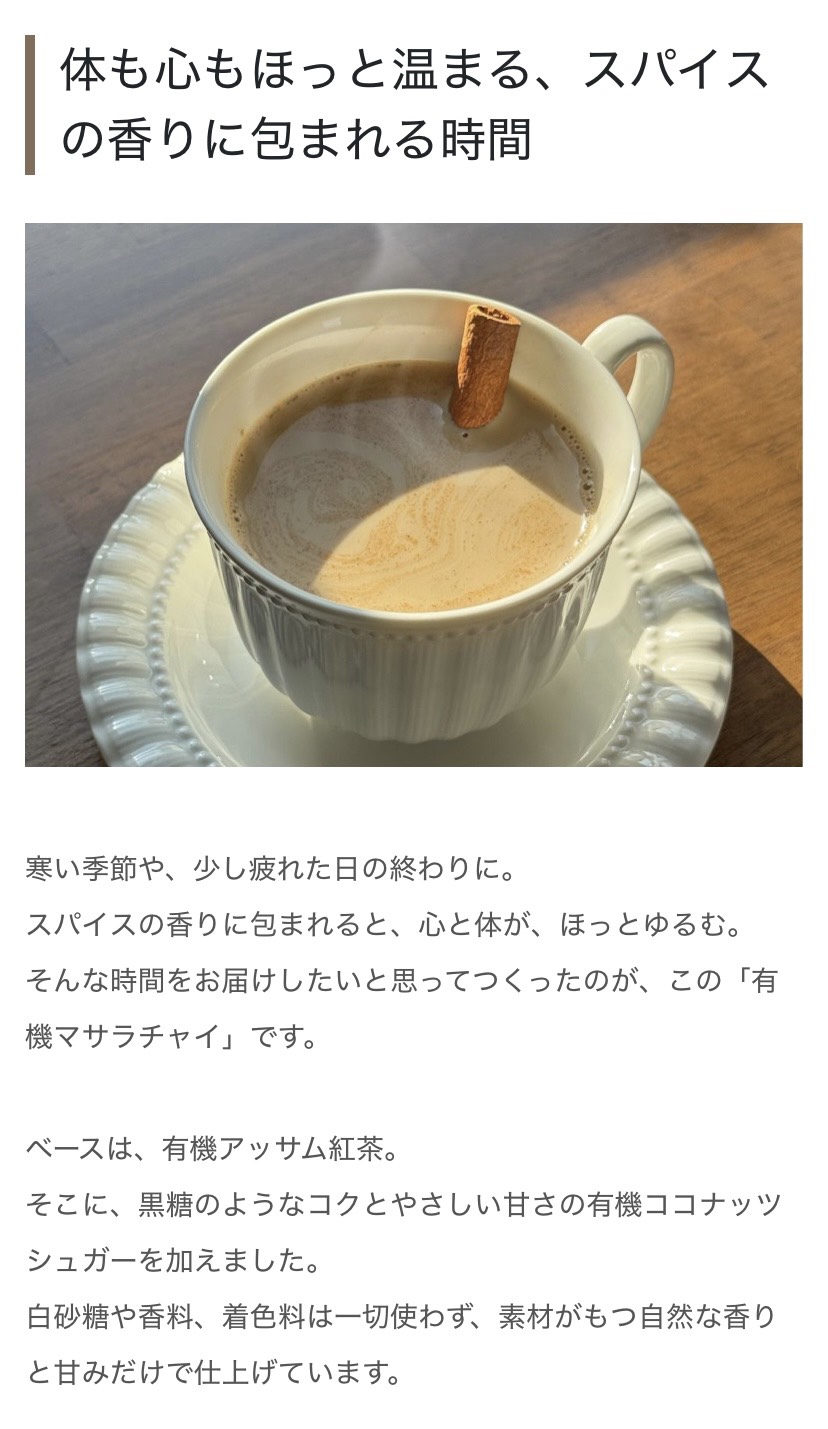 | 原材料名 | 有機ココナッツシュガー(フィリピン)、有機紅茶(インド)、シナモン(ベトナム)、乾燥生姜[生姜(国産)]、クローブ、カルダモン、ナツメグ |