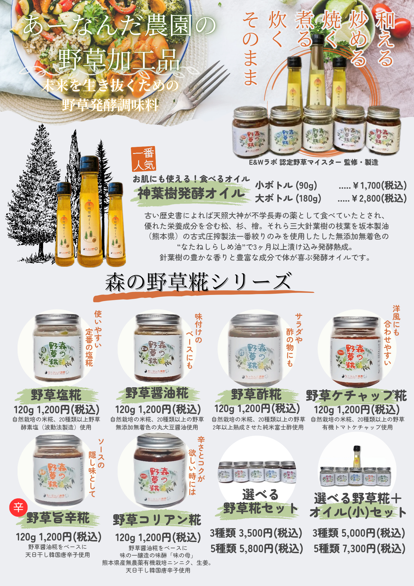 ・熊本県菊池市の鞍岳の麓にある"あ-なんだ農園"でE&Wラボ 認定野草マイスターが採取した旬の20種類以上の生野草と自然栽培(無農薬無肥料)の米糀、こだわりの調味料を使っています