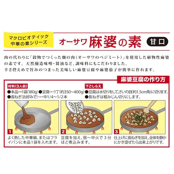 | 調理方法 | 1.よく熱した中華鍋、またはフライパンに本品を加えます。2.水切りして、さいの目に切った豆腐(1丁)を加え、中火で温めます。3.お好みに応じてみじん切りにした長ねぎを加え、煮立ったら火を止めて出来上がり。 |