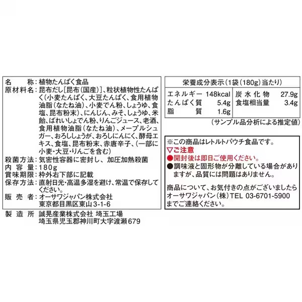 | 原材料名 | 昆布だし、オーサワそのまま使えるベジミート(畑の肉)、特別栽培にんじん(国産)、味噌、醤油、米飴、馬鈴薯でん粉、オーサワのりんごジュース、老酒、なたね油、メープルシュガー、おろし生姜[生姜(国産)]、おろしにんにく[にんにく(国産)]、酵母エキス、食塩(海の精)、昆布粉末、赤唐辛子(中国産) |