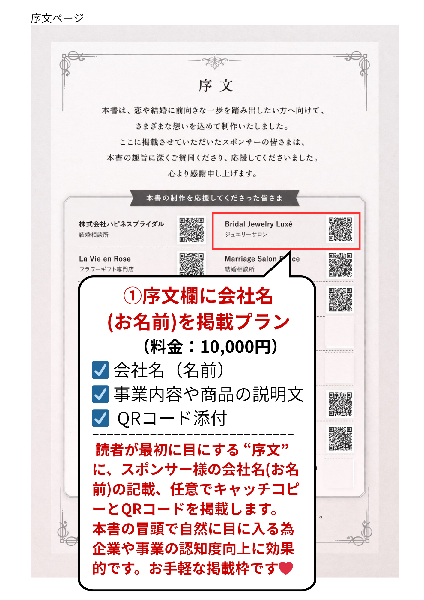 読者が最初に目にする “序文” に、スポンサー様の会社名(お名前)を記載します。