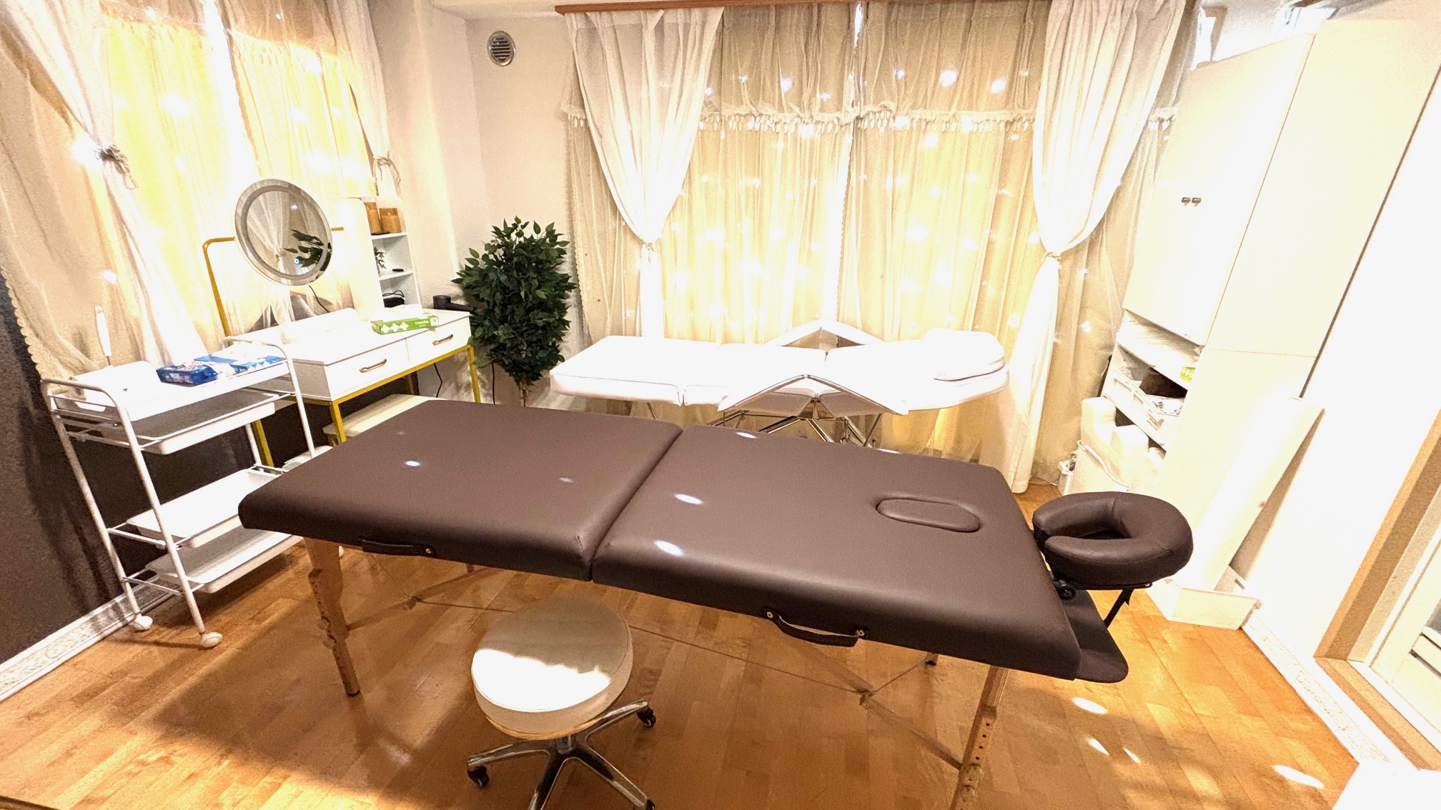 マッサージベッドとエステベッドが1台ずつ、カウンセリング用の対面のデスクを置いています。