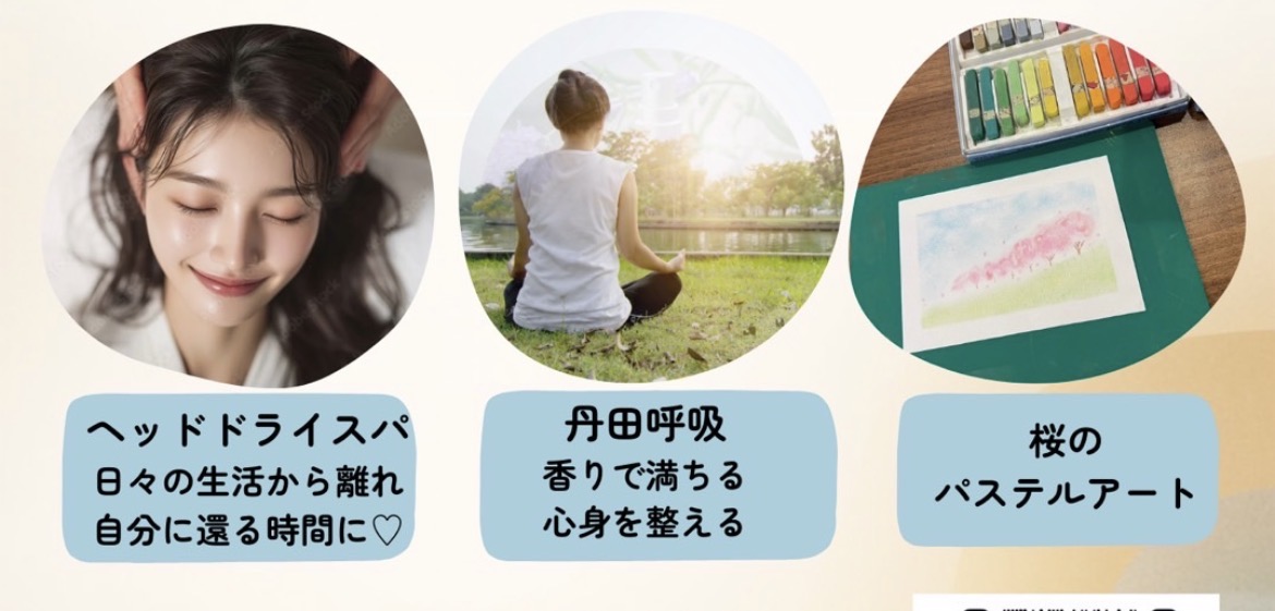 メディカルアロマを使った丹田呼吸やヘッドドライスパ、桜のパステルアートを体験できますよお問い合わせ、お申し込みはメール下さい。