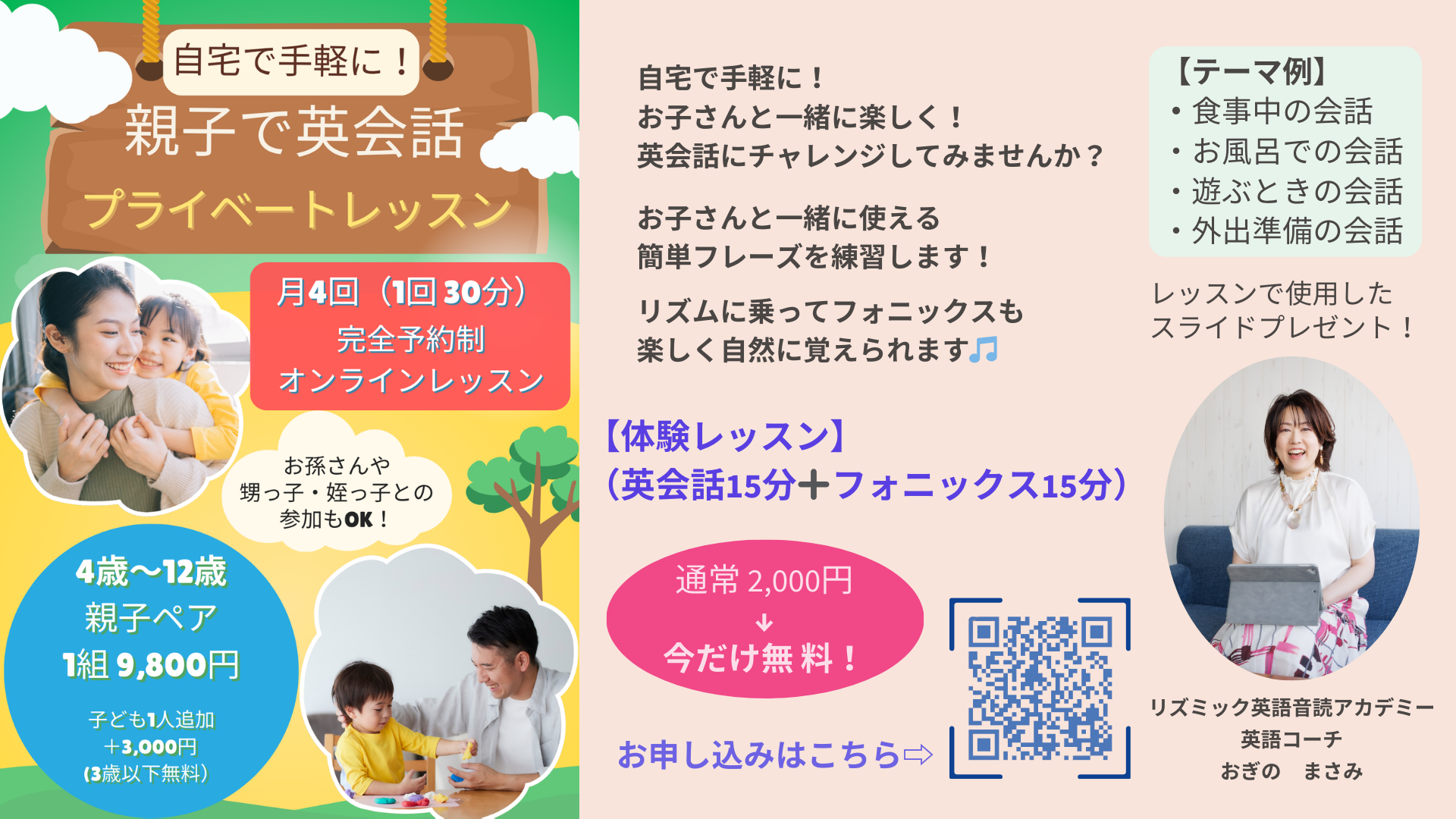親子で使えるシーンのフレーズ練習と楽しいフォニックスレッスンをまずは体感してください!