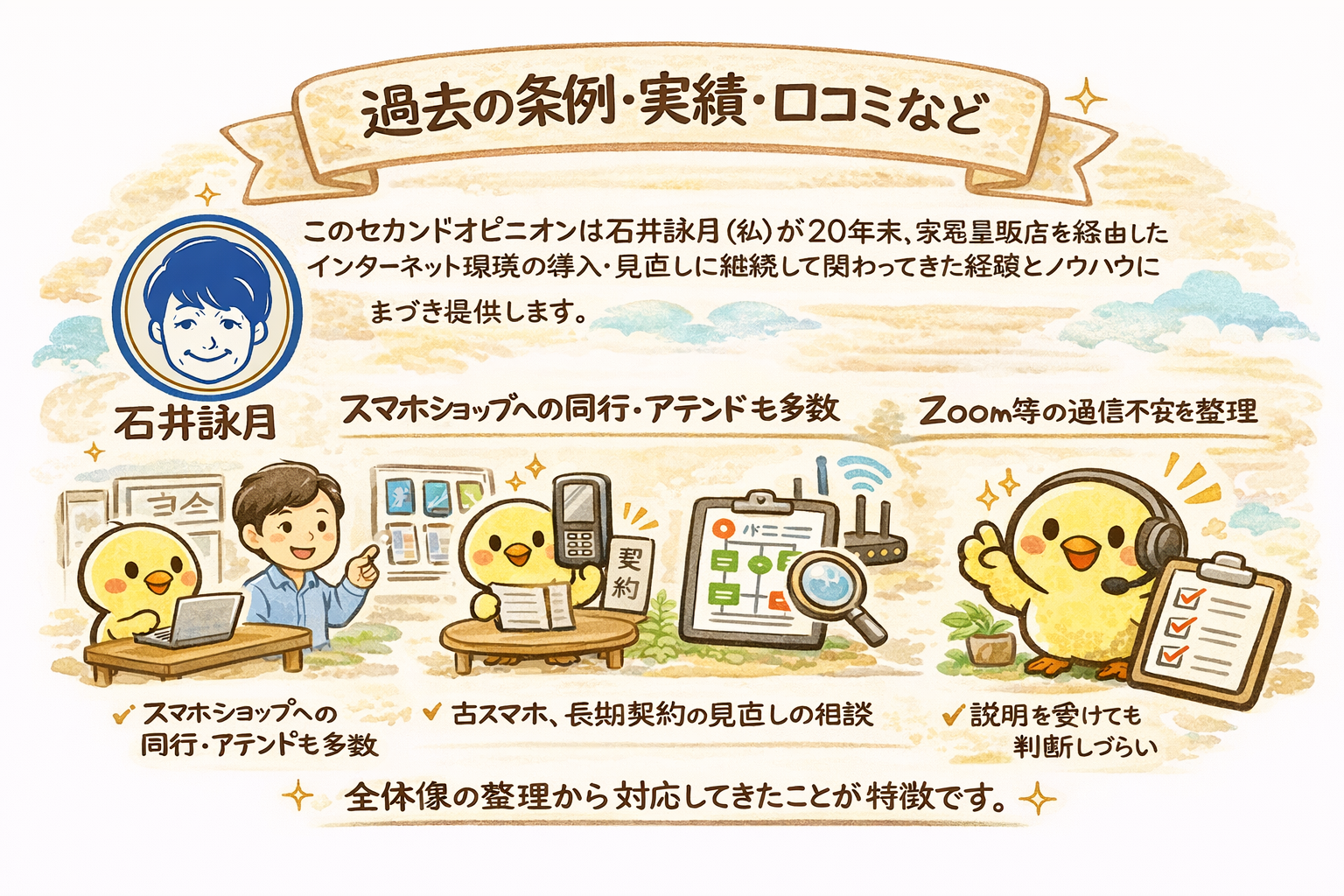 このセカンドオピニオンは石井詠月私が20年来、家電量販店を経由したインターネット環境の導入・見直しに継続して関わってきた経験とノウハウに基づき提供します。