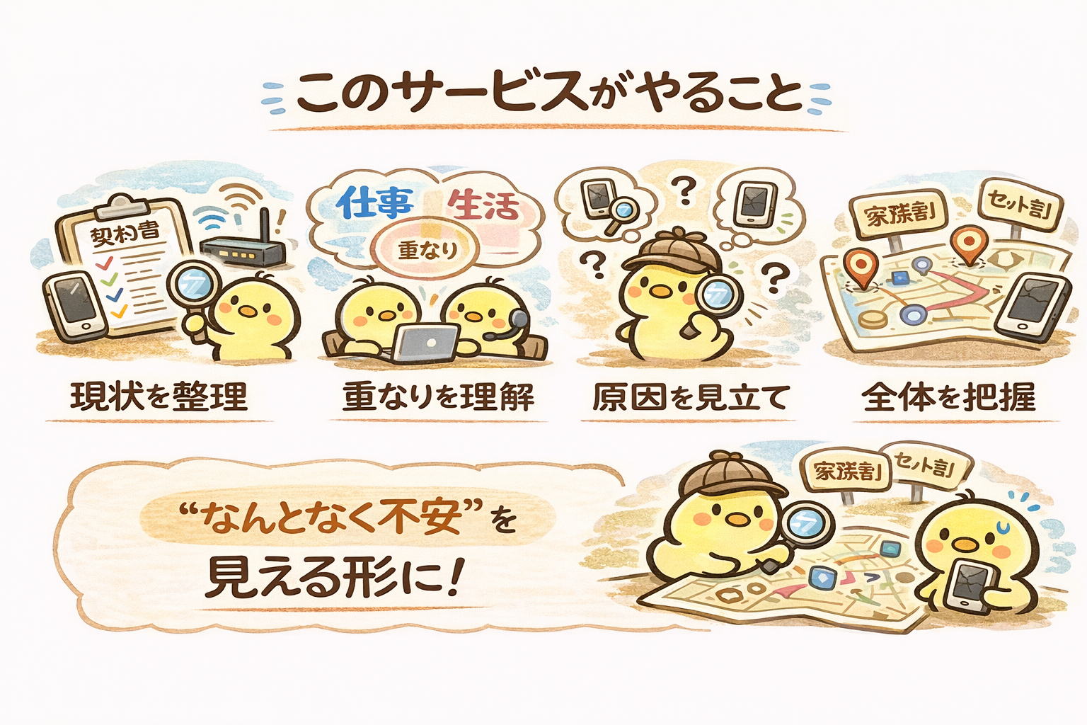 - スマホ・回線・Wi-Fi・契約状況などを見える化していきます。