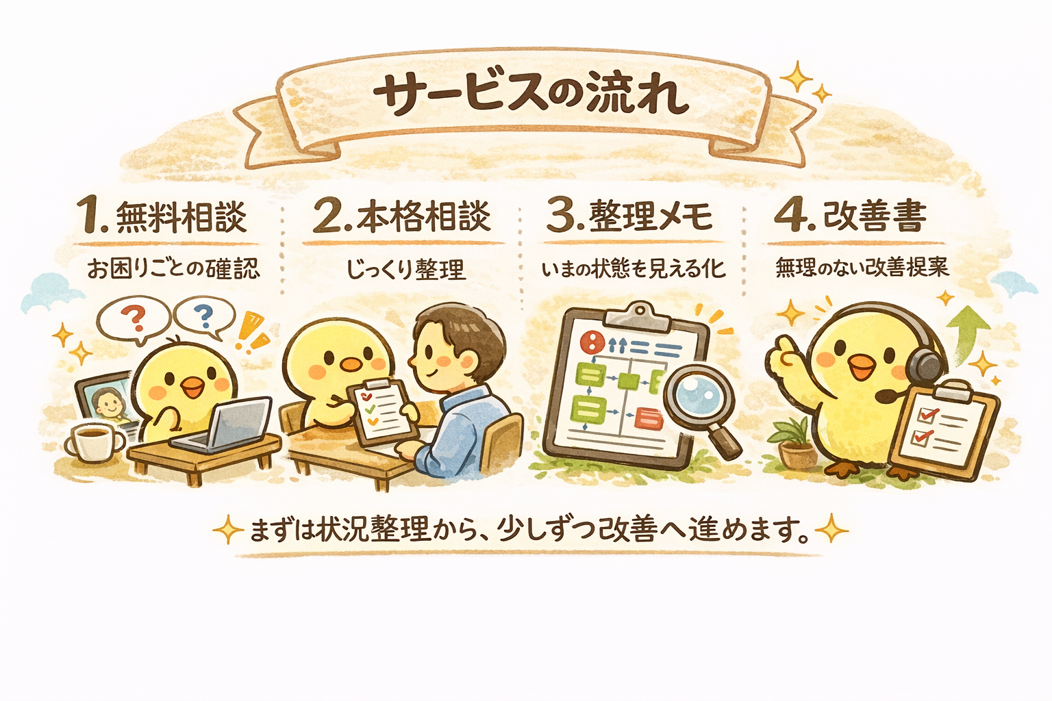 - 問題点の整理、何から見直すべきかの方向性を一緒に確認します。