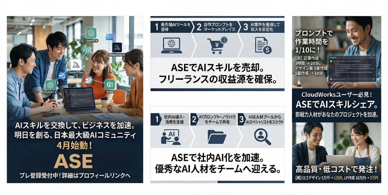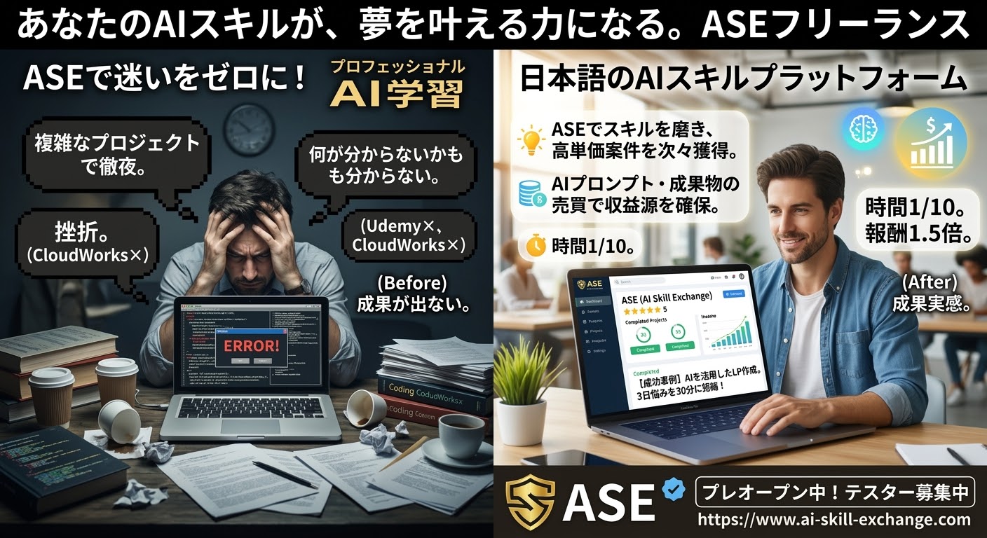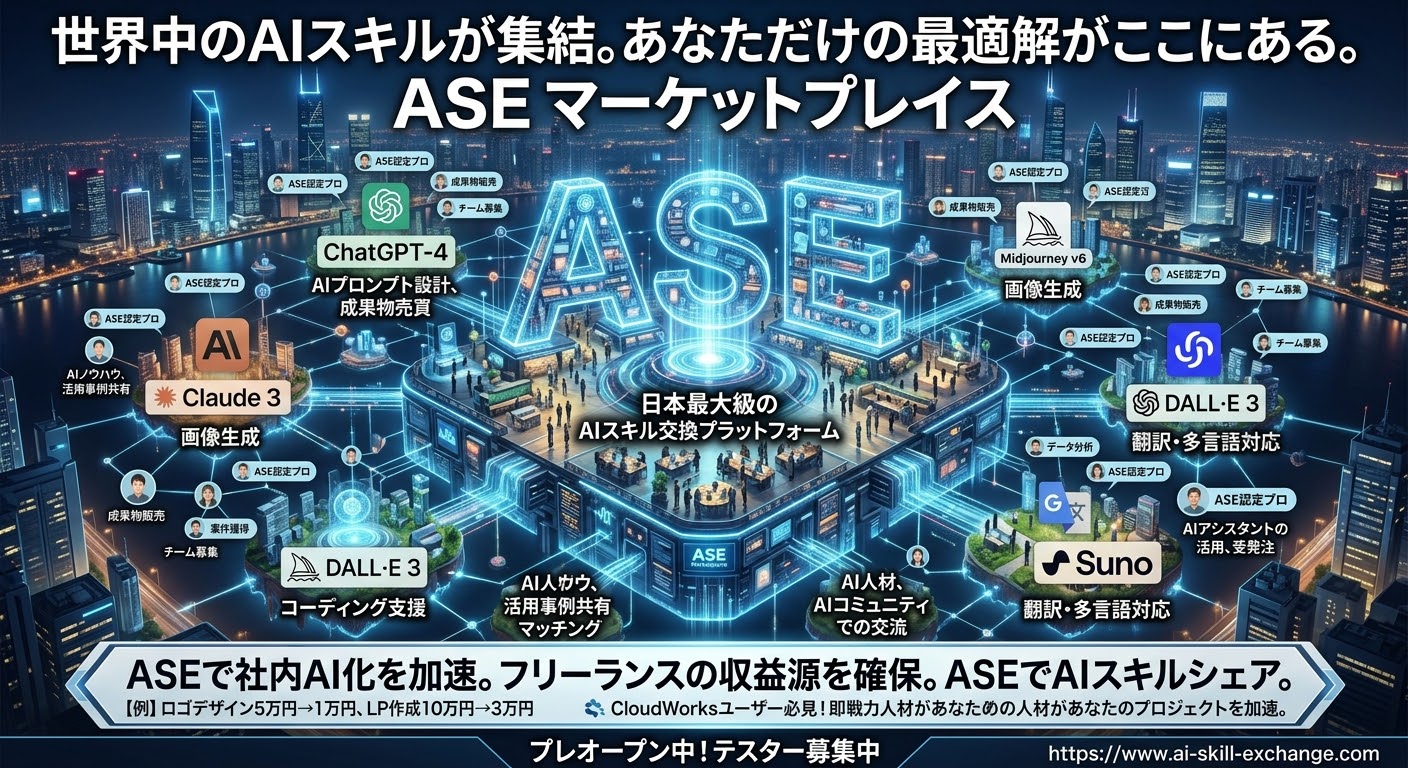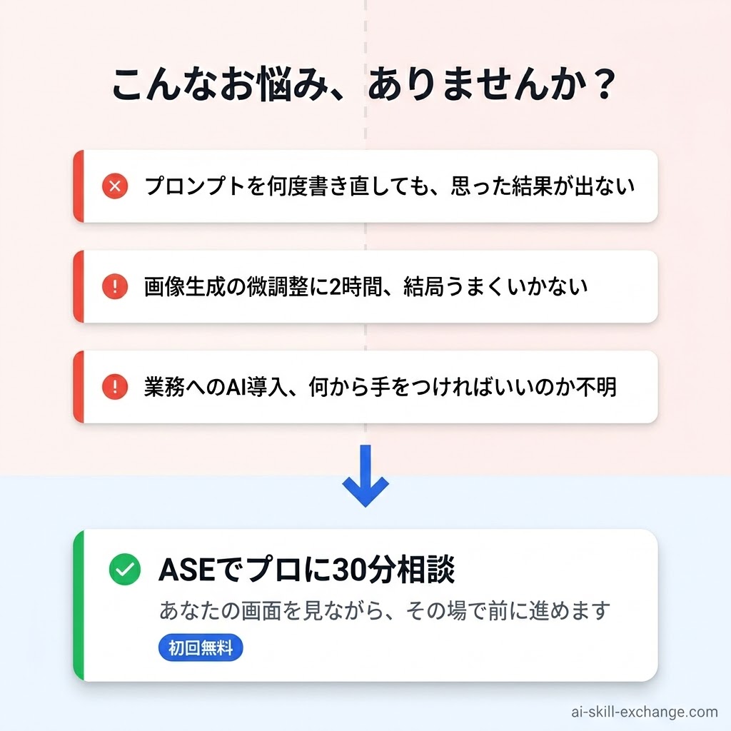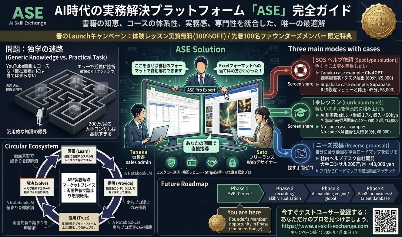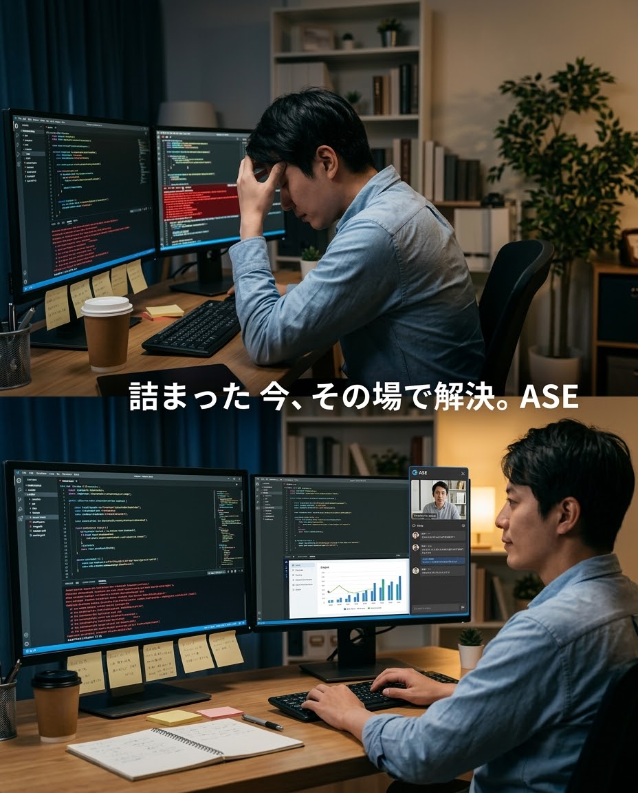 AI Skill Exchange(ASE)は、AI実務の経験者とあなたを1対1・30分でつなぐオンラインプラットフォームです。
