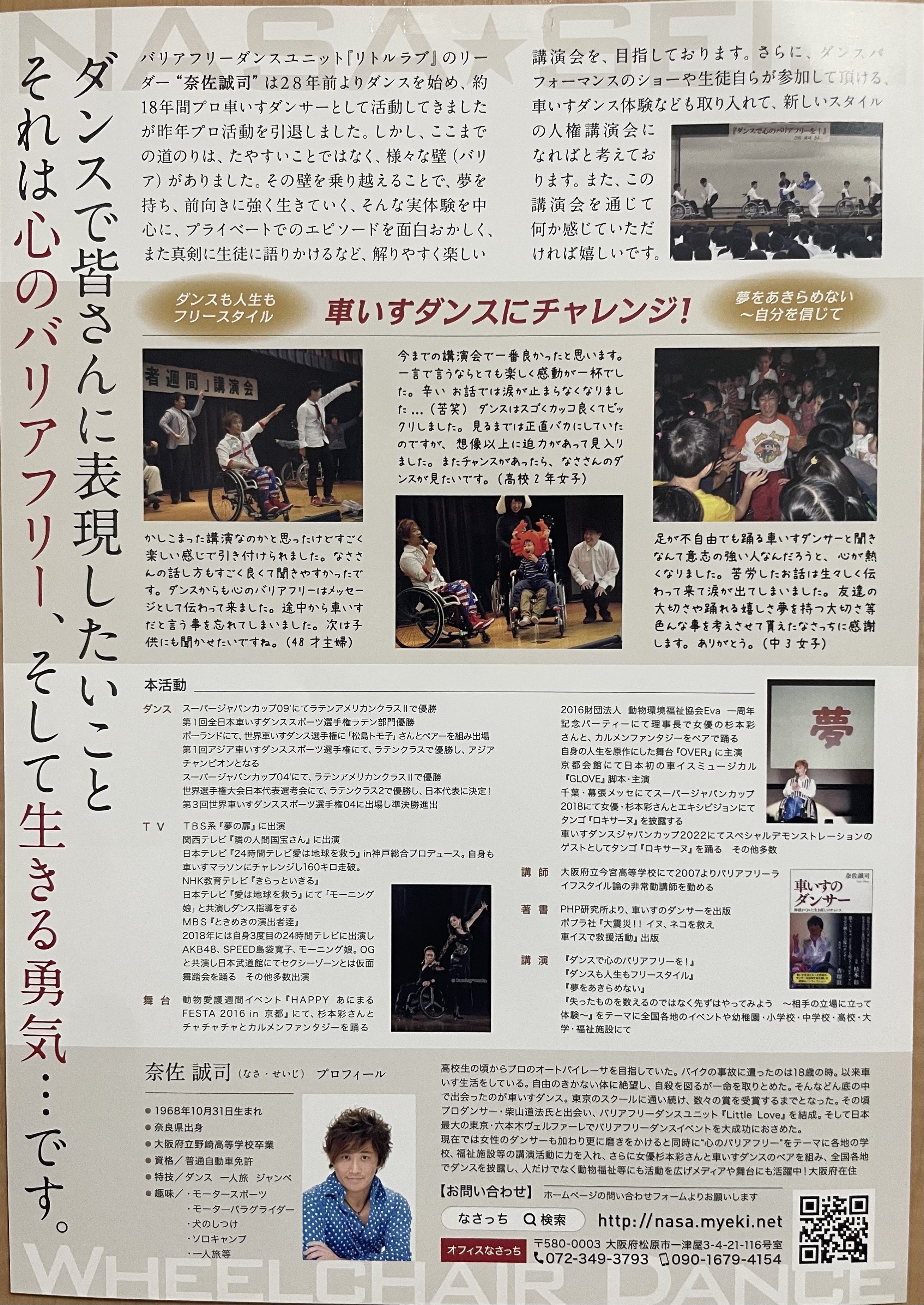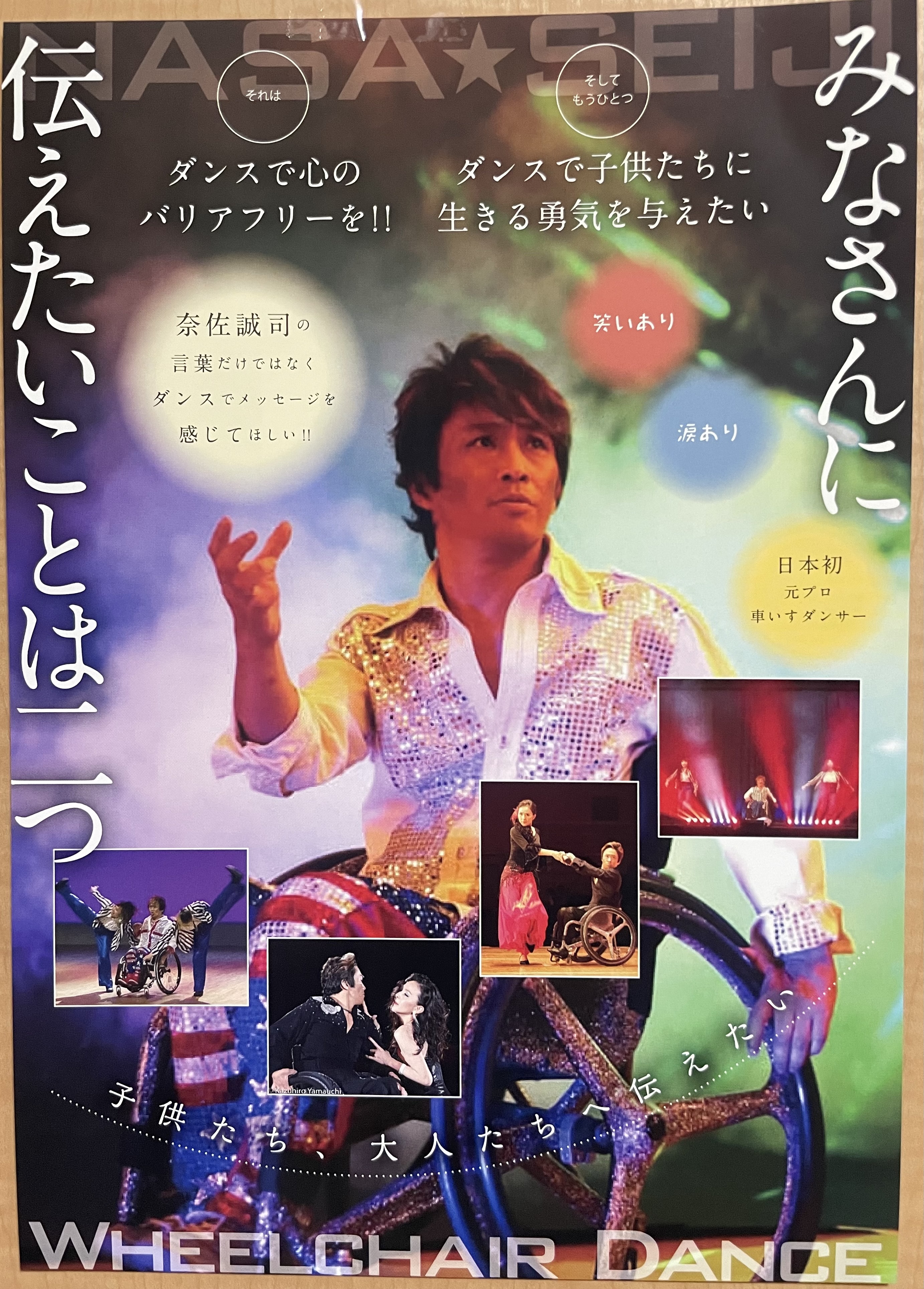 元プロ車椅子ダンサー奈佐誠司による、ダンスパフォーマンスいかがですか?普段は、学校様向けの講演会で「心のバリアフリー」をテーマに車椅子ダンスを通じて、人権講演活動させていただいております。どうぞよろしくお願いします。