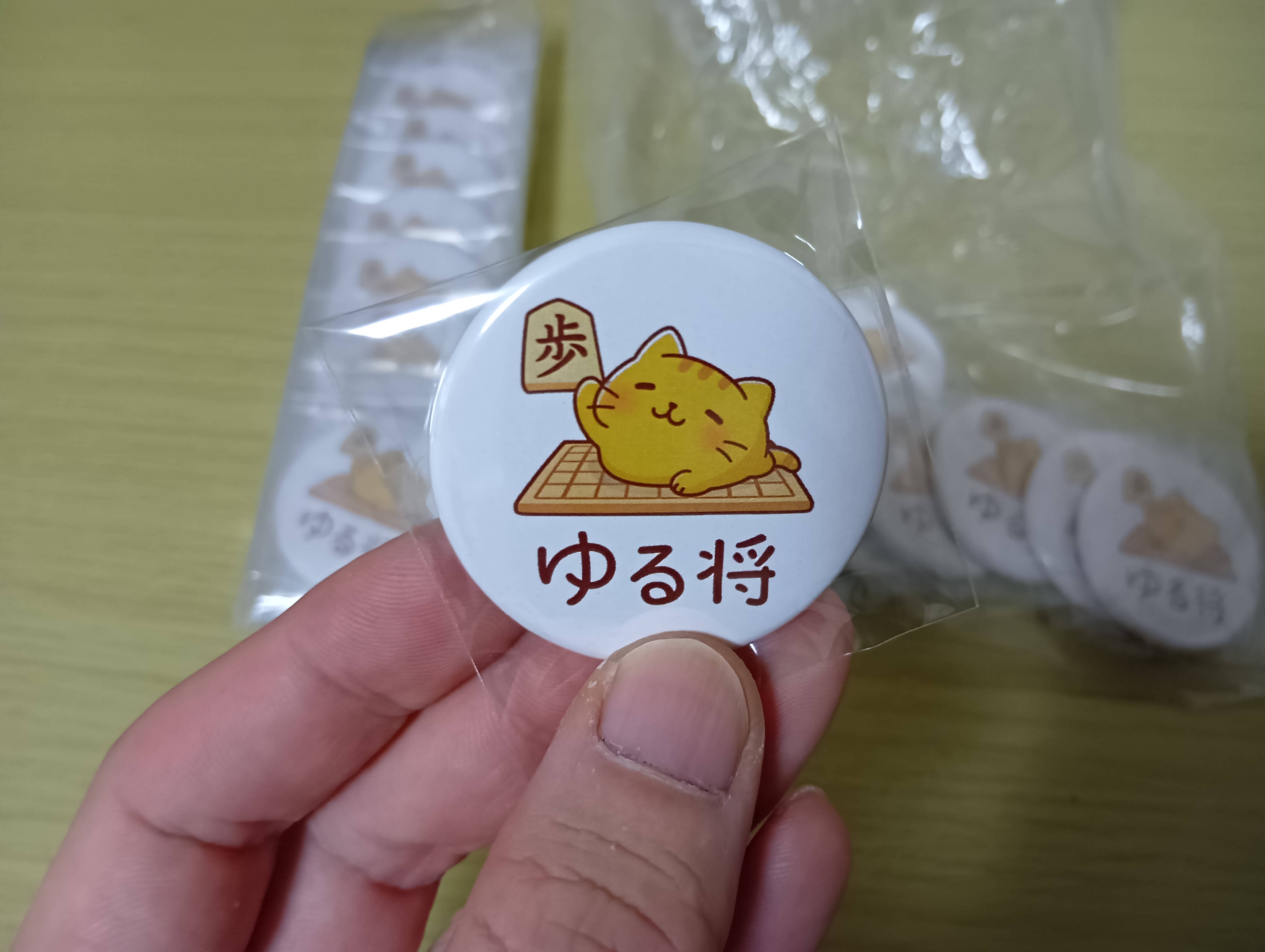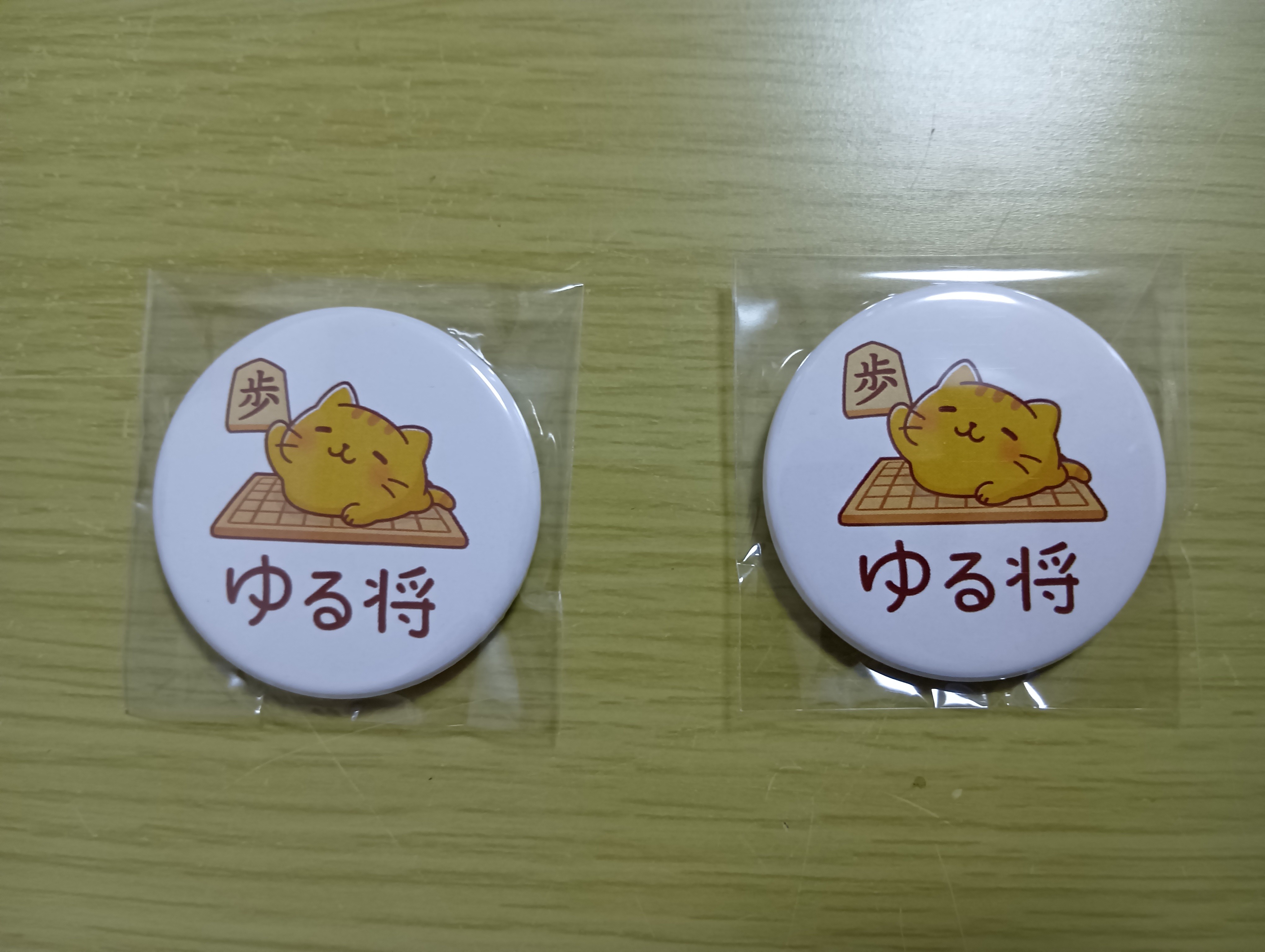 ゆるっと癒される「ゆる将」シリーズの缶バッジ、2個セットです。 将棋盤の上でのんびり寝そべる猫が「歩」の駒を持っている、 やさしい雰囲気のオリジナルデザインです。