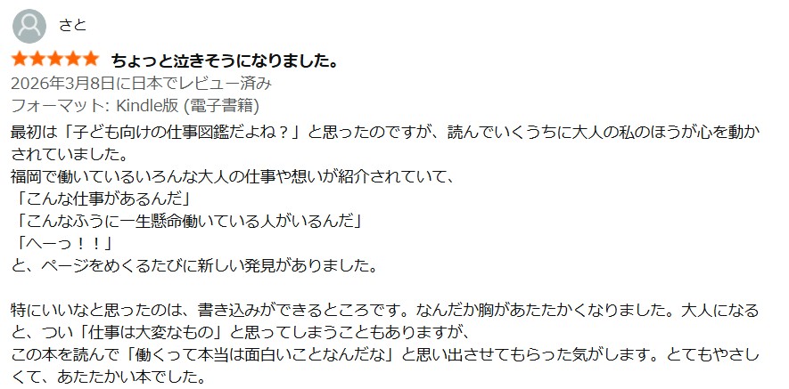 > 子ども向けかと思いきや、読み進めるうちに「働くって本当は面白いことなんだ」と思い出させてもらいました。ページをめくるたびに、一生懸命働く大人たちの物語に新しい発見があり、胸が温かくなりました。(Amazonレビューより抜粋)