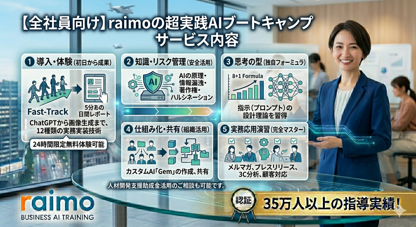 単なるツールの操作説明ではなく、組織的な「標準スキル」としてのAI活用基盤を確立することを目的としています 。