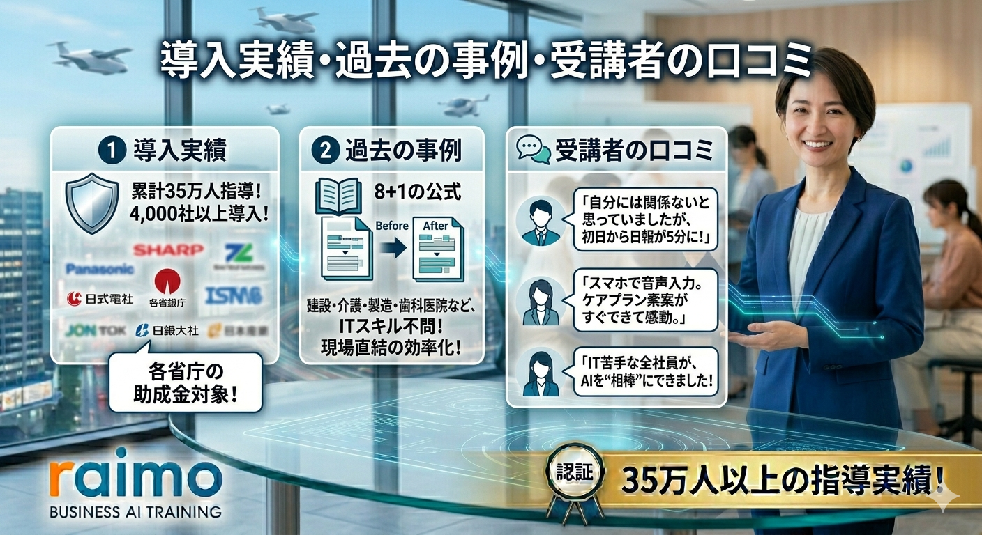 ・セキュリティ: 入力データがAIの学習に利用されないGoogle Workspace(Gemini)を主な環境として推奨しており、企業の機密を守りつつ安全に活用いただけます 。
