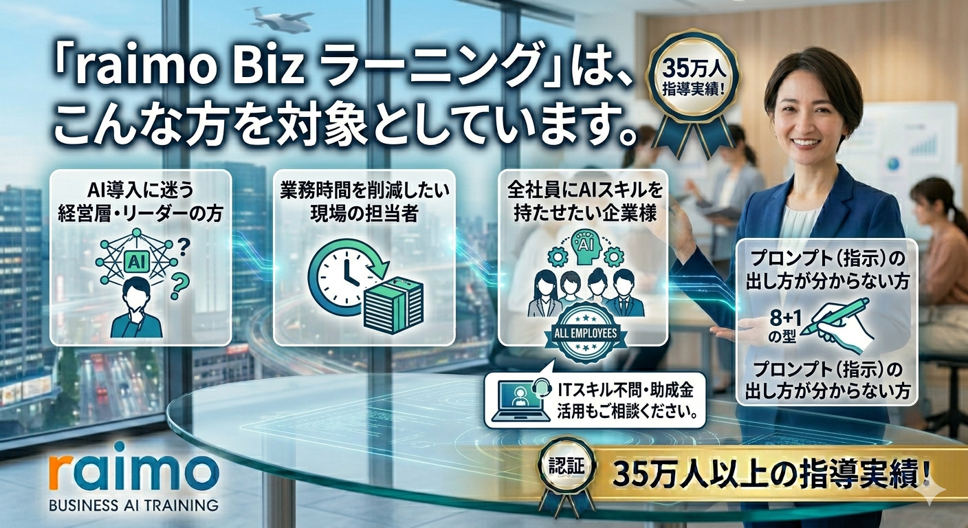 「AIが使えなかったのは、御社のせいじゃありません。」 2026年、AIはメールが書ける人なら誰でも使いこなせる「インフラ」になりました。 現場直結のスキルを、御社の全社員へお届けします。