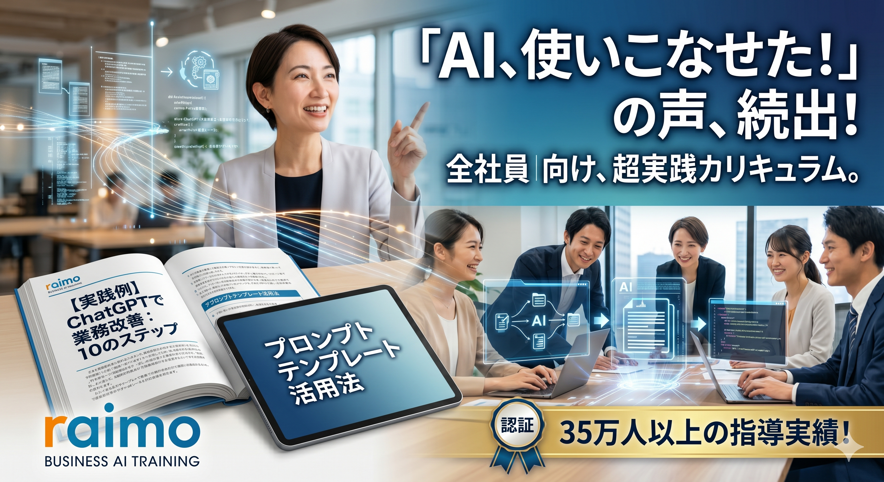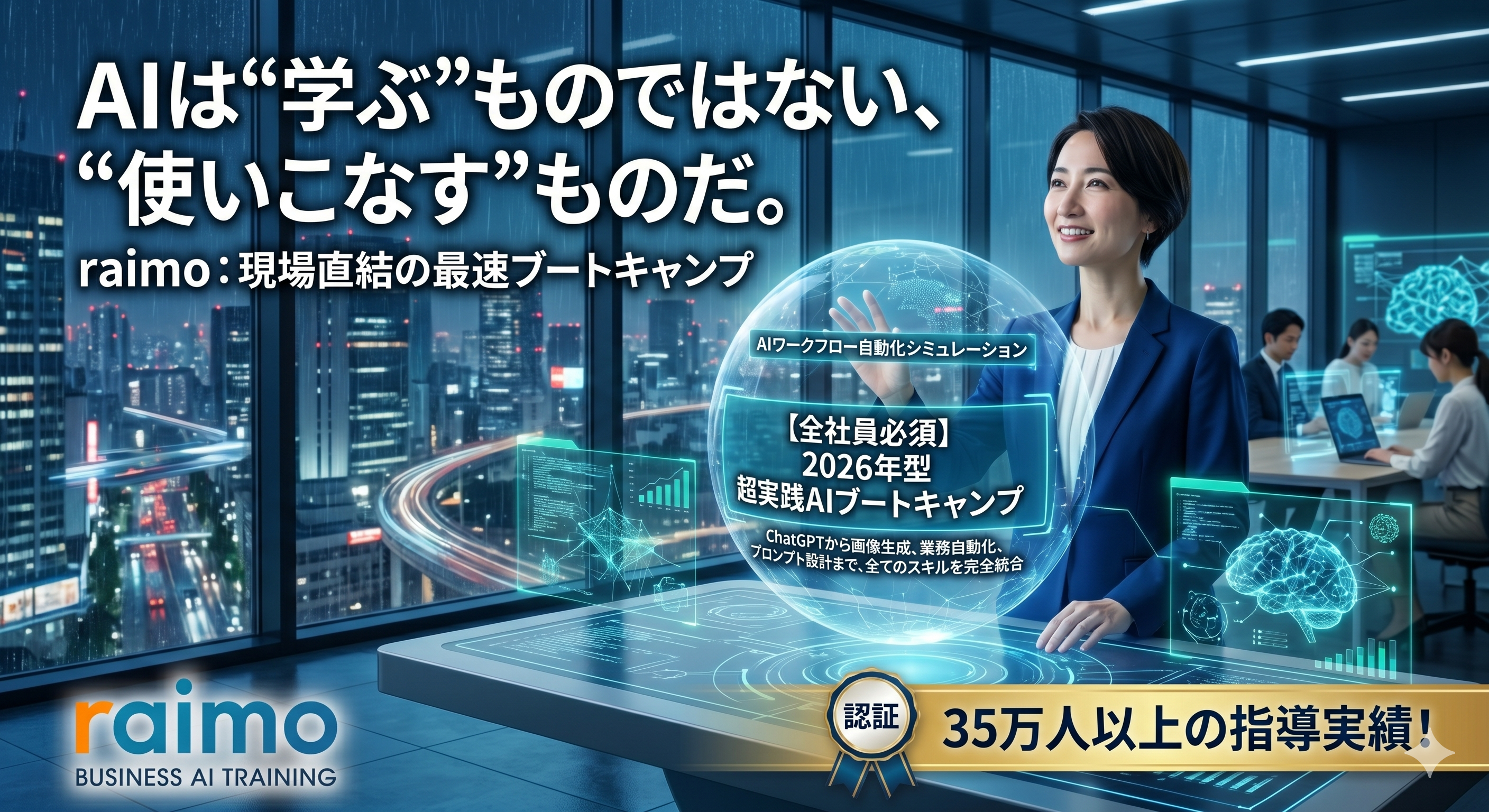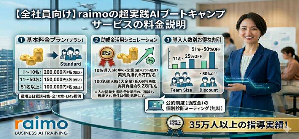 本サービスは、延べ35万人への指導実績を体系化した、実践型のオンラインAI研修プログラムです 。