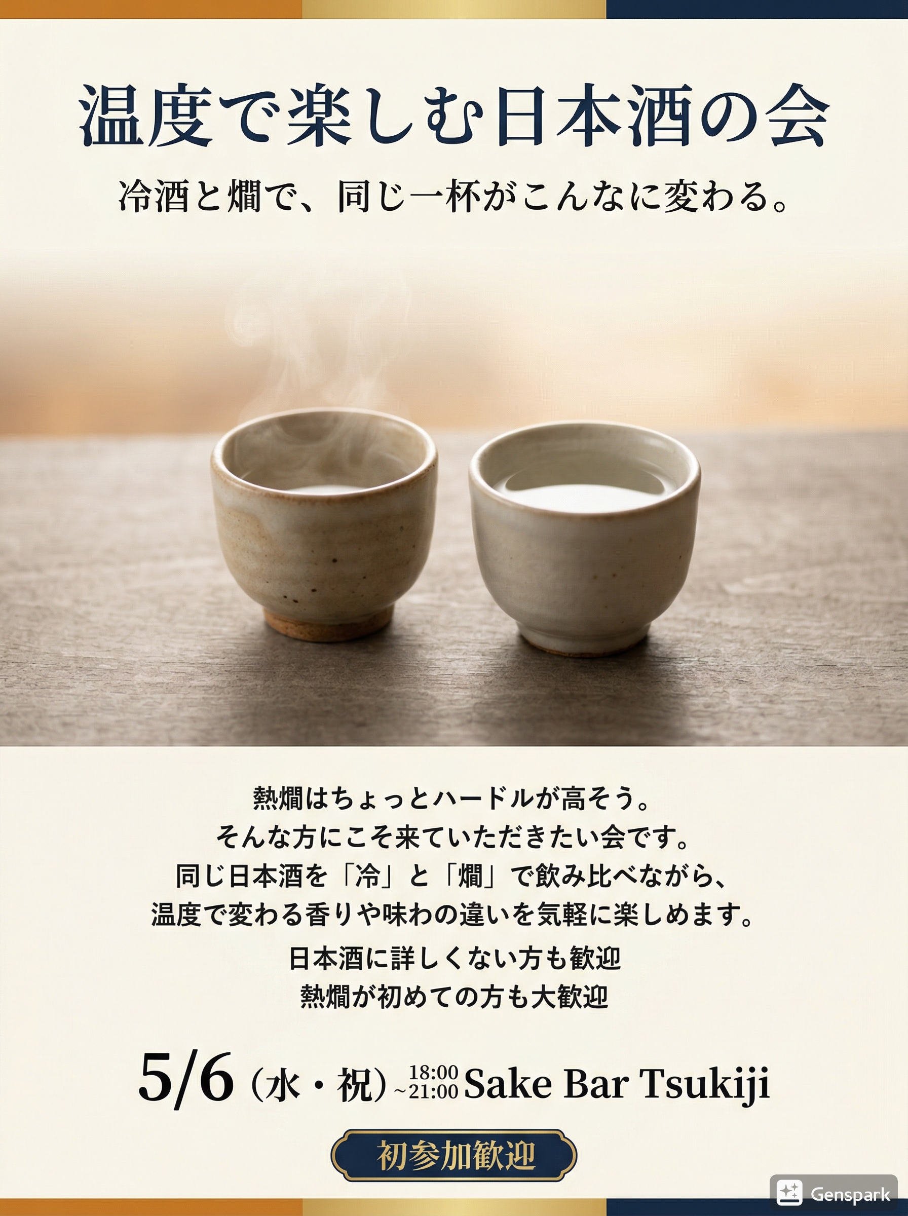 この会では、同じ日本酒を冷と燗で飲み比べながら、温度で変わる香りや味わいの違いを気軽に楽しんでいただけます。
