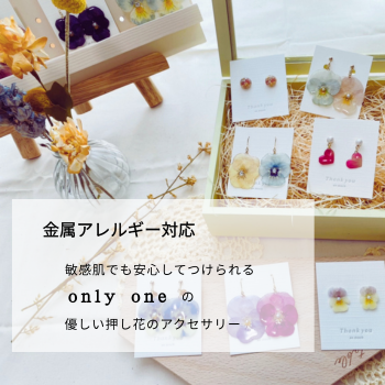 金属アレルギーフリーで敏感肌でも安心してつけられる押し花のアクセサリーを販売中!