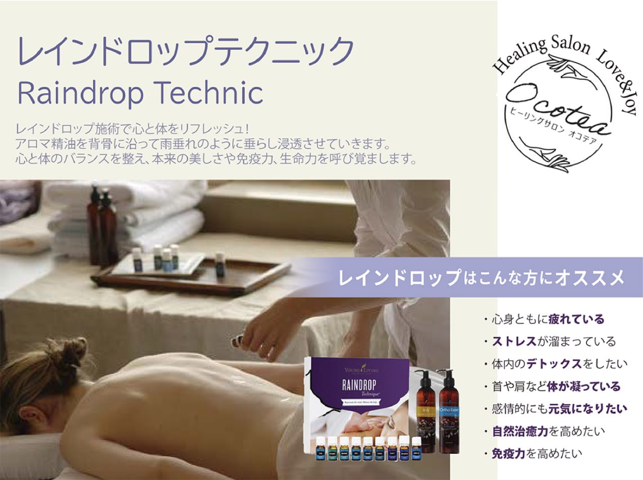 高品質のエッセンシャルオイルを、背中に落としていき、羽のような優しいタッチで浸透させていくアロマヒーリングテクニックです。