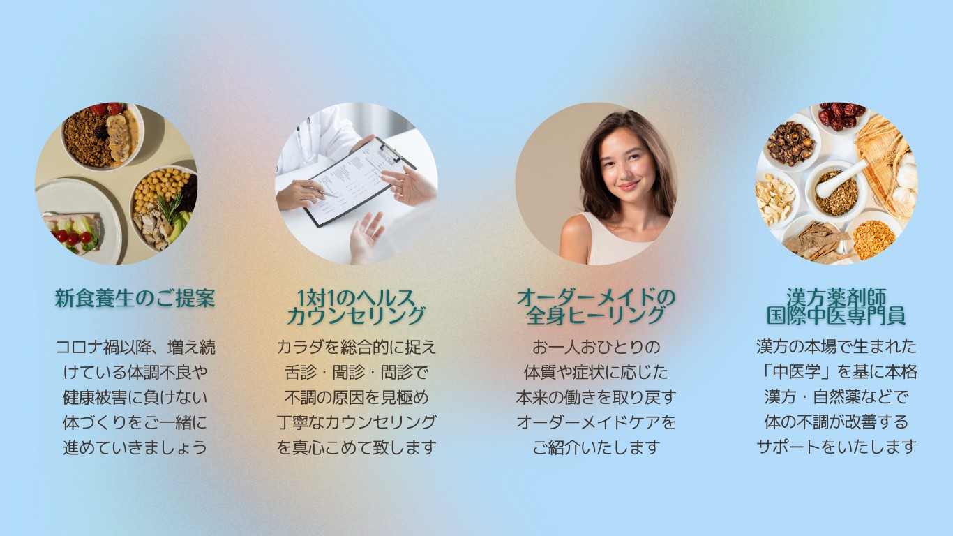 た【新食養生】や自然薬品や漢方薬との組み合わせ等をカウンセリングにてご提案します。
