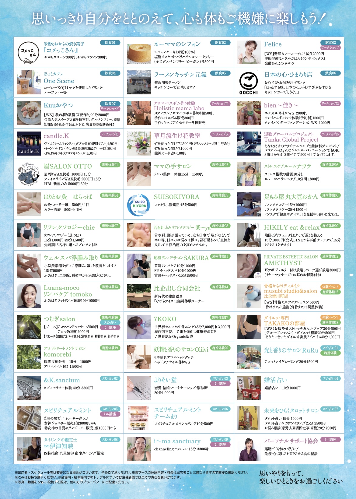52ブースで施術やワークショップなど、様々な体験ができる内容になります。