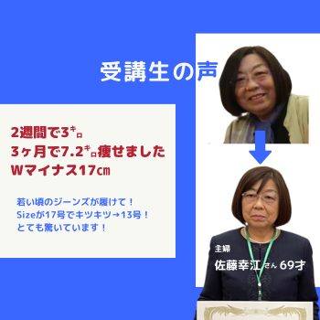 《69才女性》2週間で3㌔、3ヶ月で7.2㌔痩せました。サイズは17号→13号に 2.5ヶ月でWマイナス17㎝達成