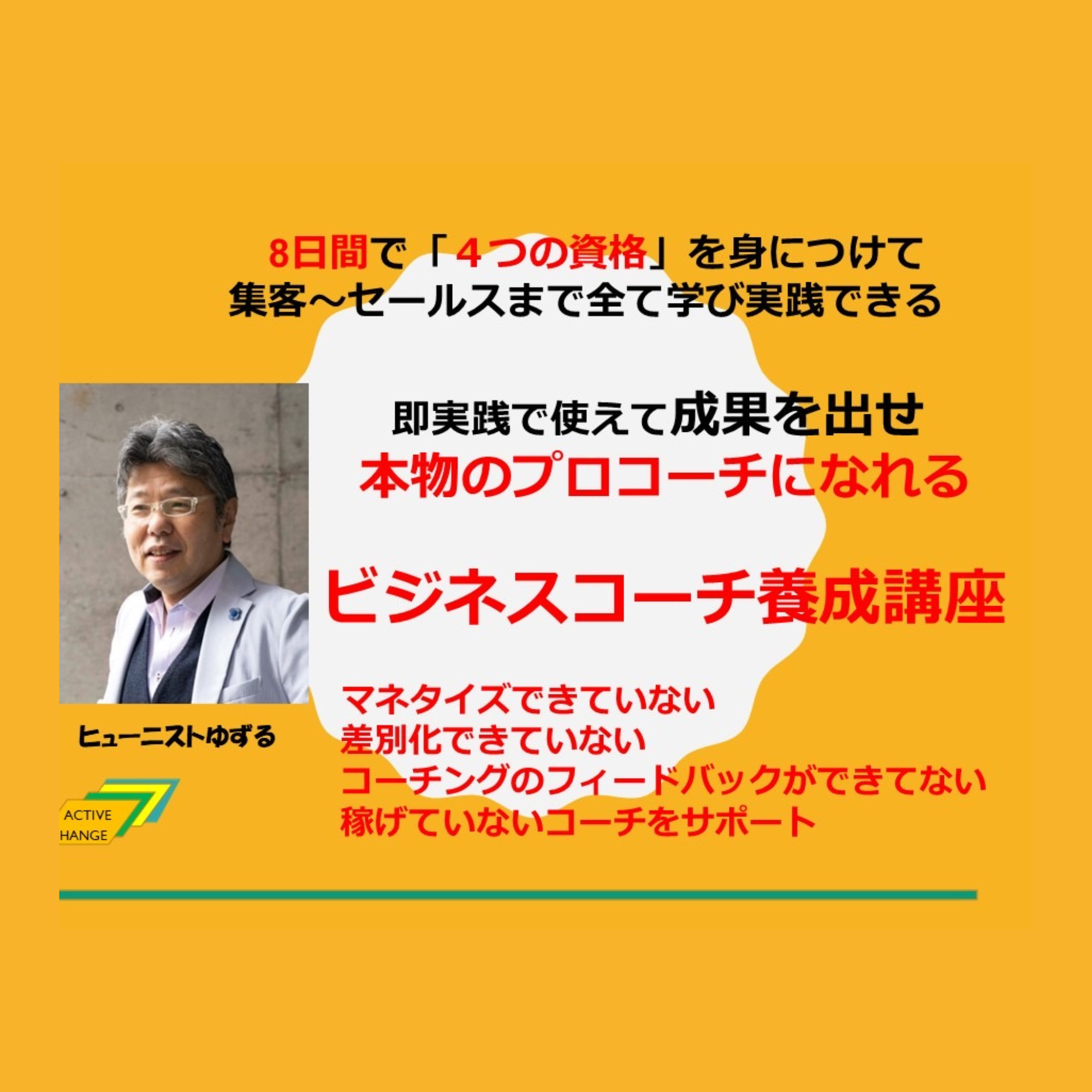 3ヶ月間で8日間の講座は、NLPプラクティショナー、ビジネスコーチ、マインドフルネスコーチ、ヒプノセラピストの4つの資格を同時に取れます。スクリプトどおりに進めていけばどんな方でもコーチングができる内容になっています。また、私がどんな方法でコーチングだけでマネタイズできたのか集客ノウハウも伝えます。