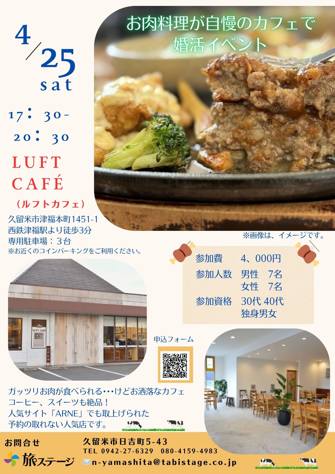 2026年4月25日開催「お肉料理が自慢のカフェで婚活イベント」 参加費4,000円