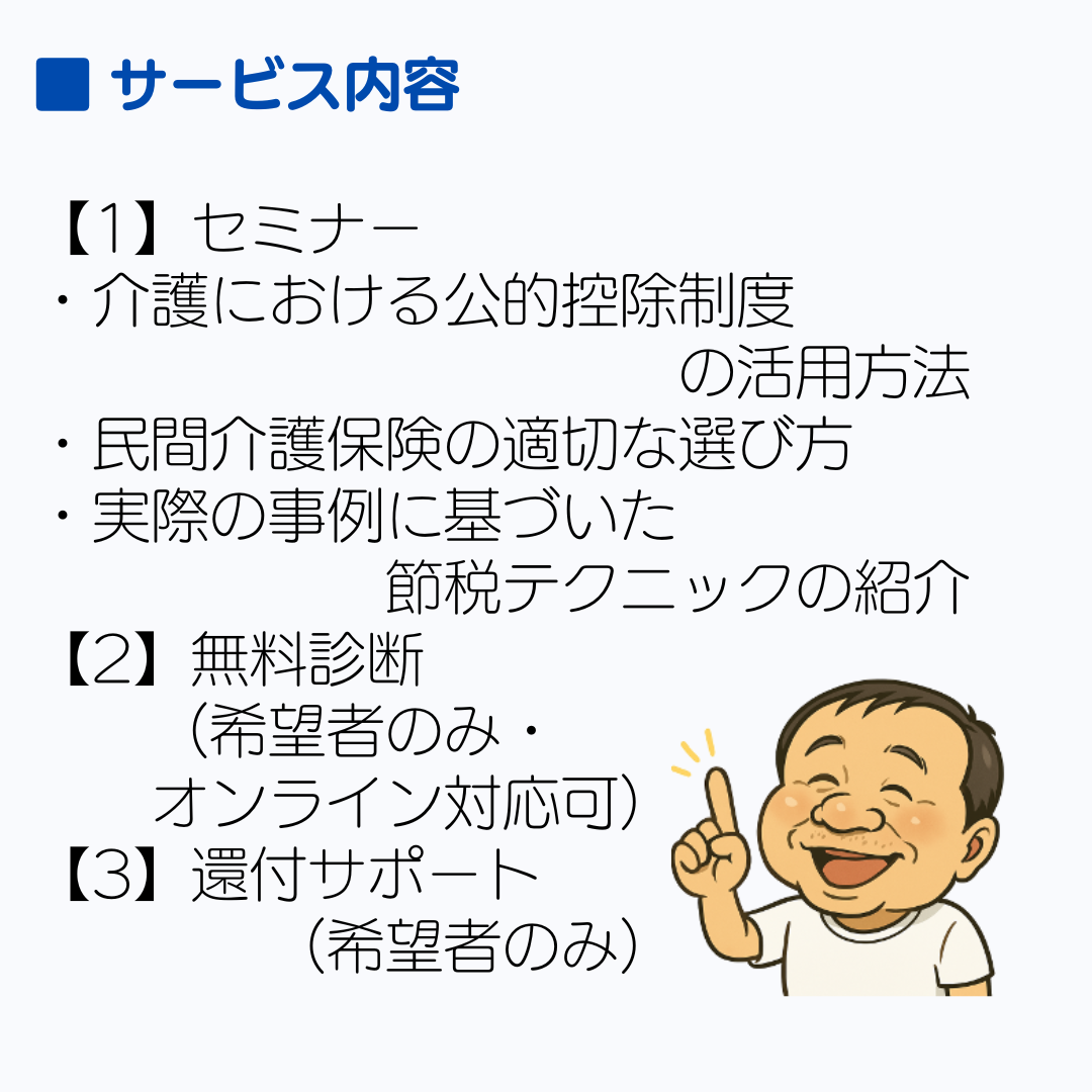 仕事と介護を両立する従業員のために、節税・還付支援を実践的にサポートするプログラムです。2025年の法改正に対応し、企業の介護支援策の一環としてもご活用いただけます。
