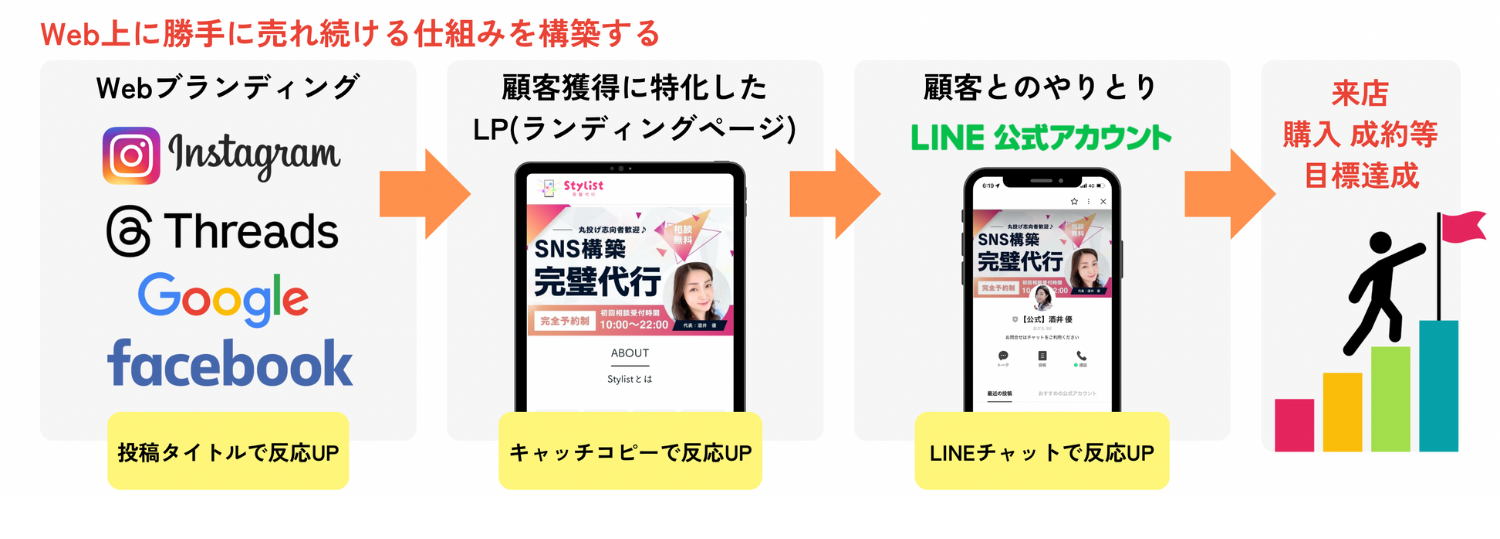 SNS投稿で興味を引いた後が大事。LPでサービスの魅力を伝えてLINE登録へ誘導、そして契約に結びつける流れの柱を制作代行いたします。LINEで自動配信や個別対応を行い、信頼構築と販売を効率化。集客から販売までを自動化し、ビジネスをスムーズに拡大!!SNS運用に必要なWEBライティングもお任せください。