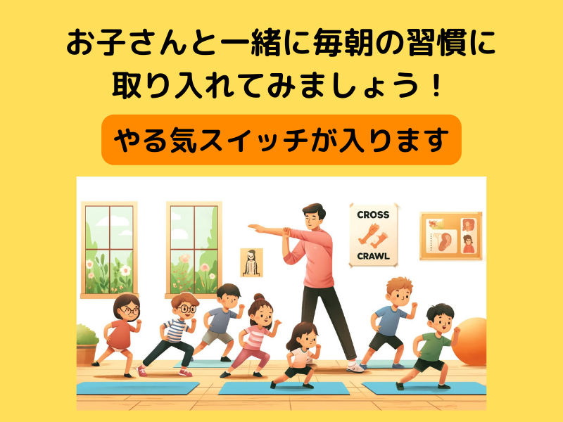 クロスクロールは、特定の身体運動を通じて脳の機能を活性化し、学習能力や集中力を向上させるためのエクササイズです。このエクササイズでは、右手と左足、左手と右足を交互に使って身体を動かします。具体的には、立った状態で右肘を左膝に、左肘を右膝に向かって交互に持ち上げる動作を繰り返します。