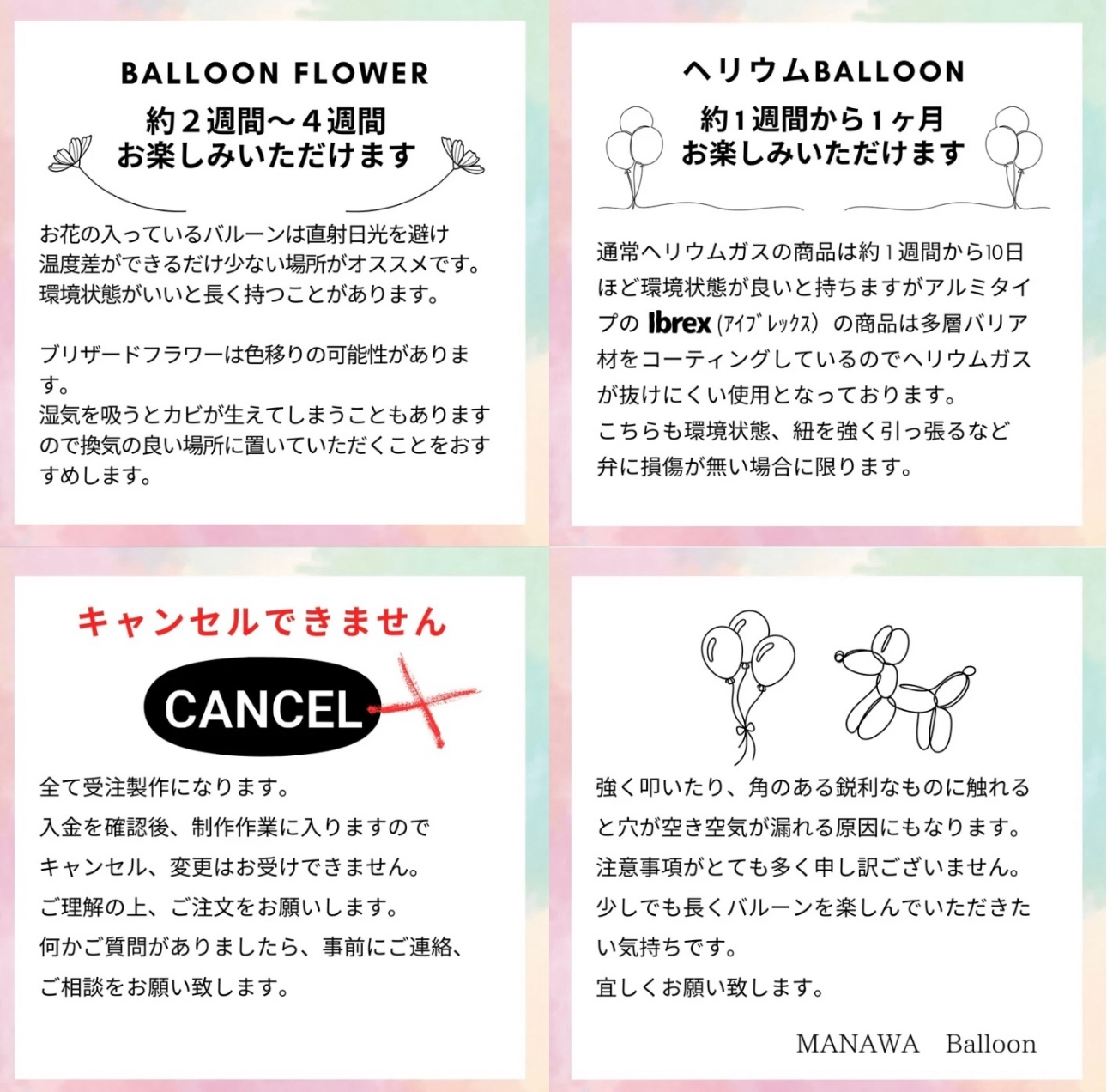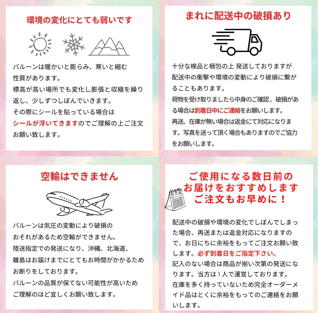 ★風船はとてもデリケートです、空気漏れがないことを、確認し発送しますが、配送中に破損の可能性もあります。ご理解の上ご注文をお願いいたします。