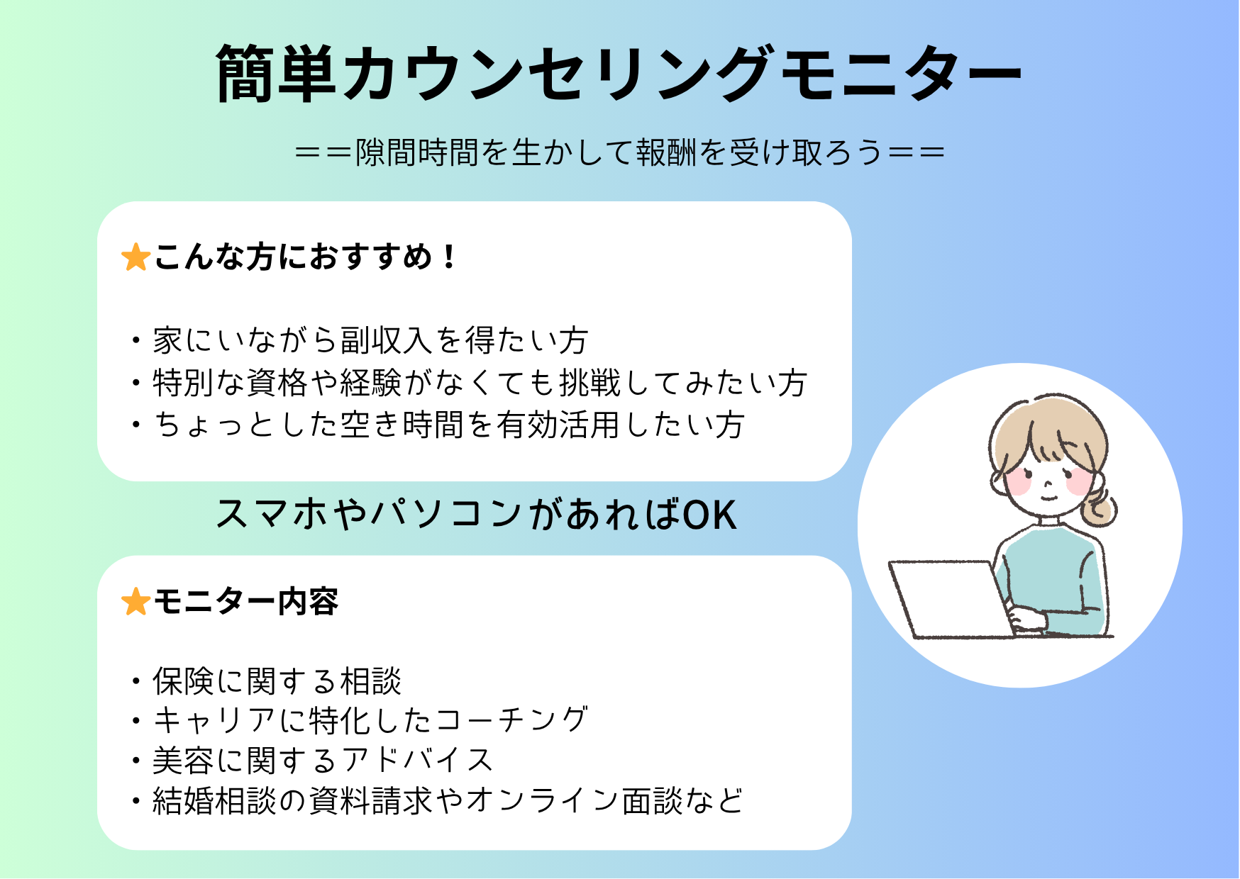 オンラインで相談やカウンセリングに参加するだけで報酬を受け取れます。