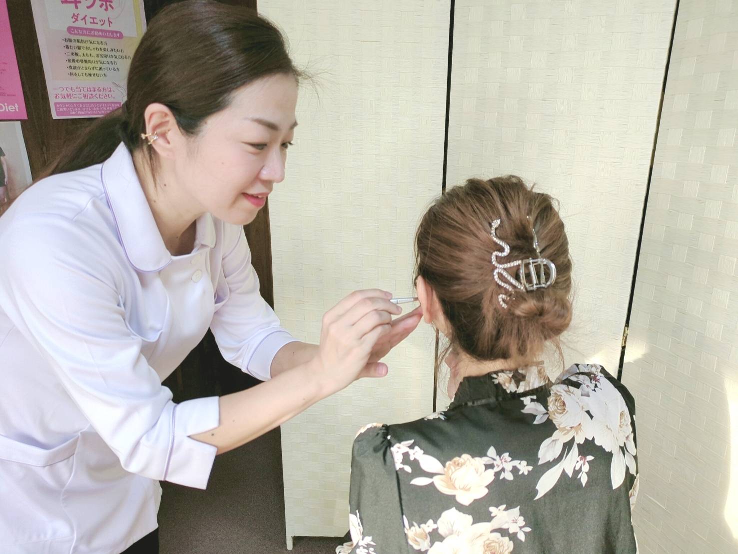耳つぼは針ではなく小さい粒を専用テープで貼ります。痛みなどありません。耳にある食欲や代謝に関わるツボを刺激して自然な減量を促す方法です。医師が検証したダイエットです!